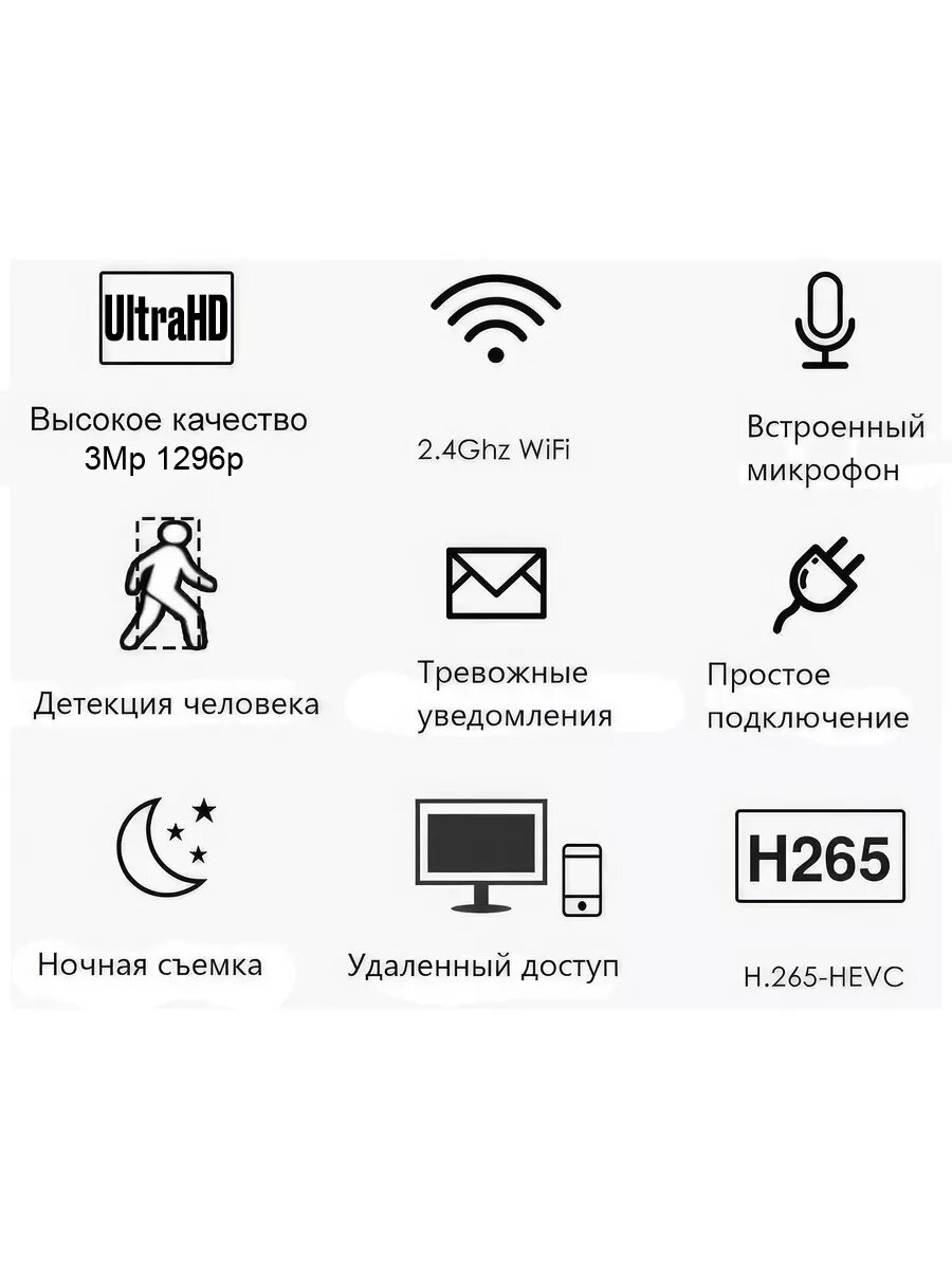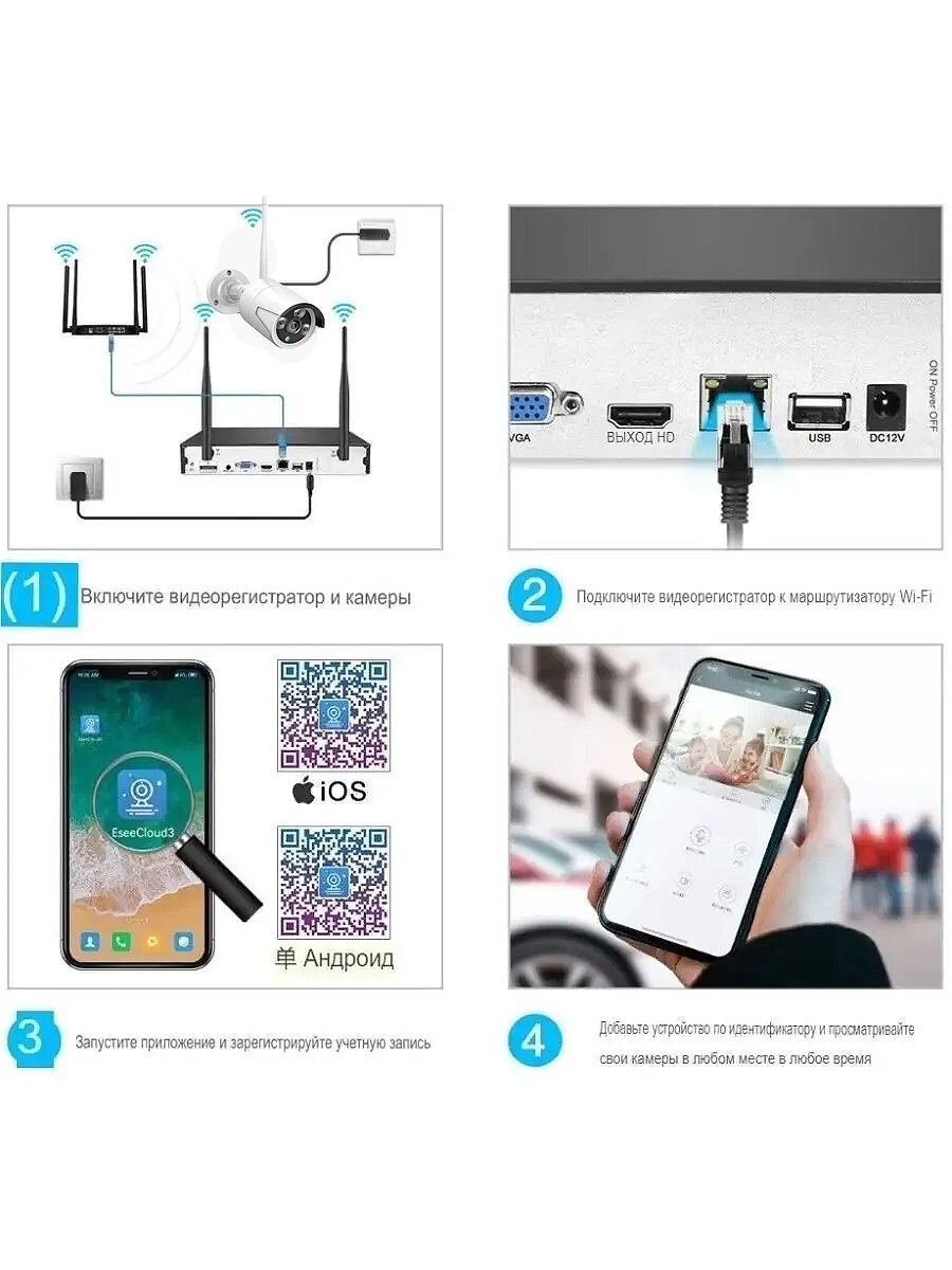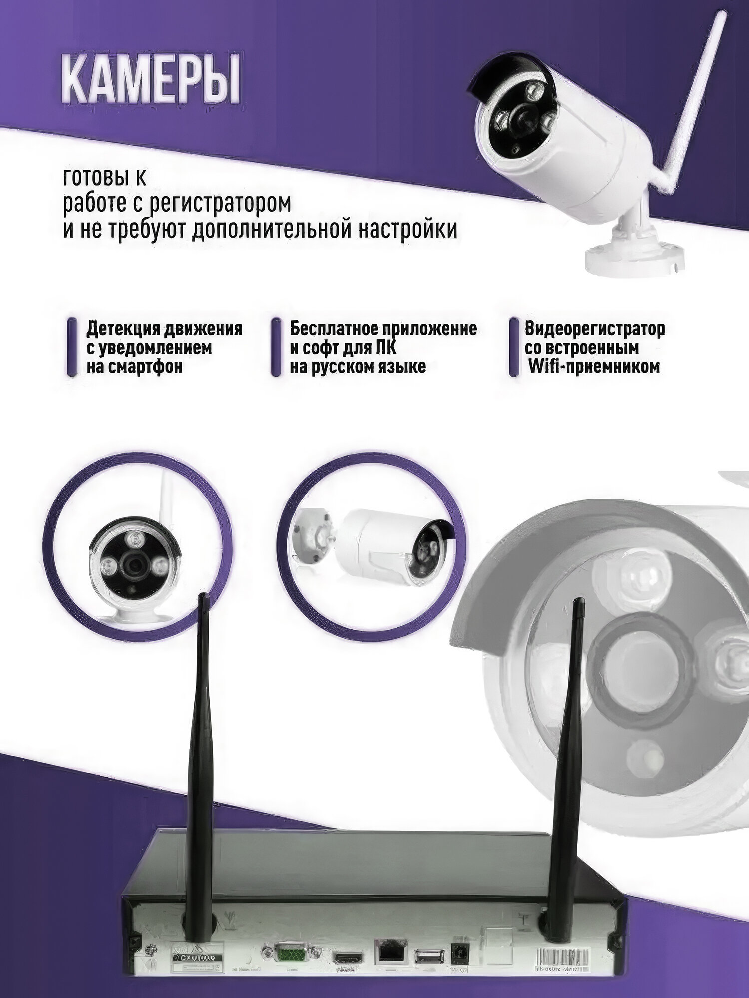 | Дополнительная информация | Детекция человека в кадре, камеры со звуком, расширение системы до 8 камер, Подключение к интернету для удаленного доступа как по проводу, так и через wifi (в том числе от 4g роутеров), удобное мобильное приложение на русском языке |