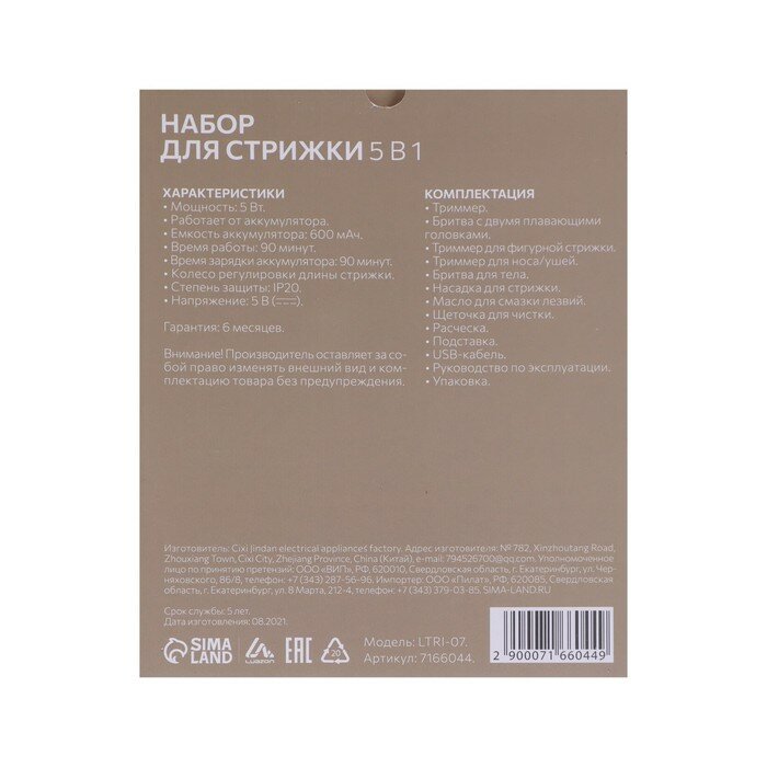 Набор для стрижки LuazON LTRI-07, 5 в 1, 5 Вт, 5 насадок, триммер, от АКБ, черный интересное: