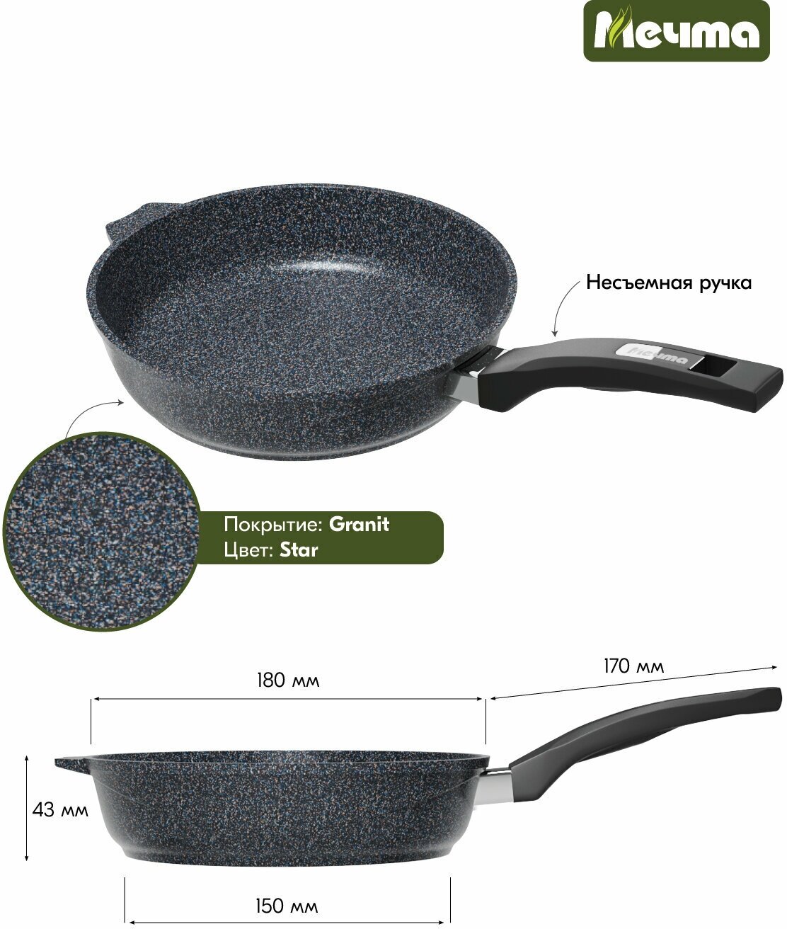 Сковорода Мечта 18 см Гранит с антипригарным покрытием с несъемной ручкой, НЕ индукционная