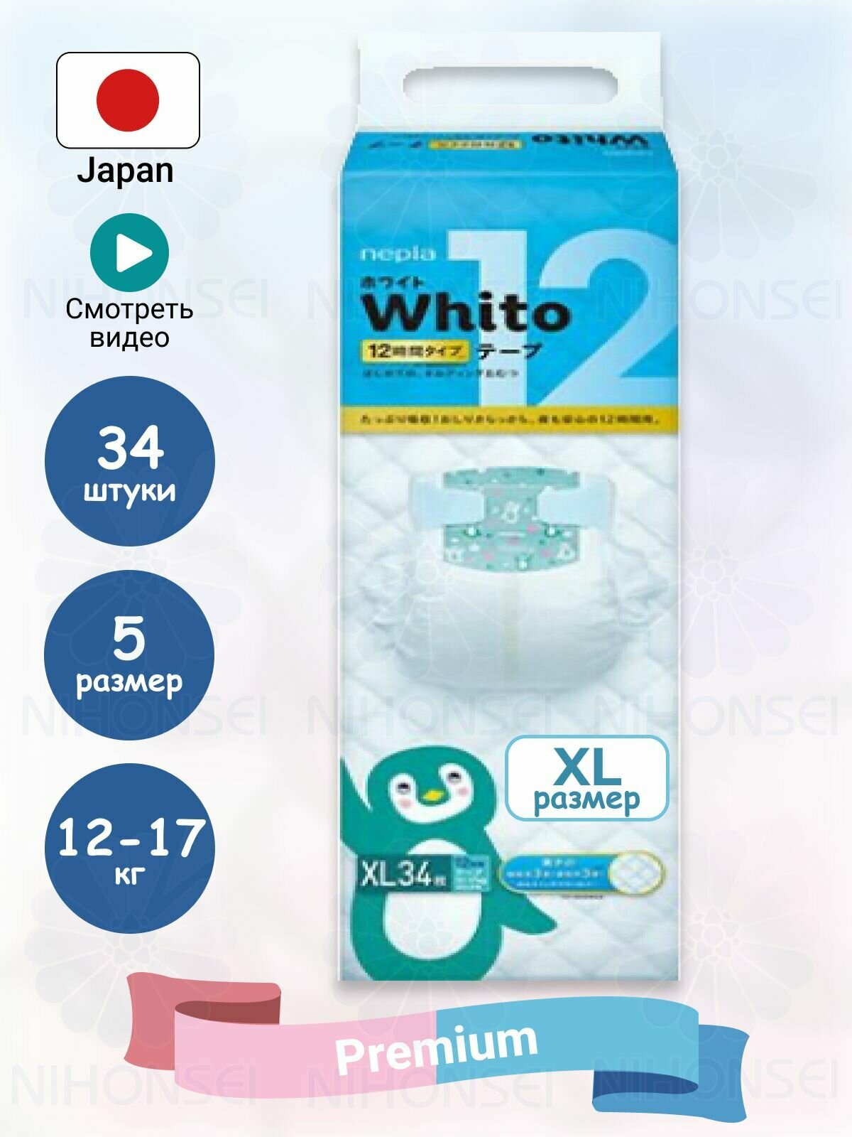 Whito Детские подгузники 34 шт., 12-17 кг, размер 5 (XL), для девочек и мальчиков 12 часовое использование / Японские памперсы трусики для детей интересное: