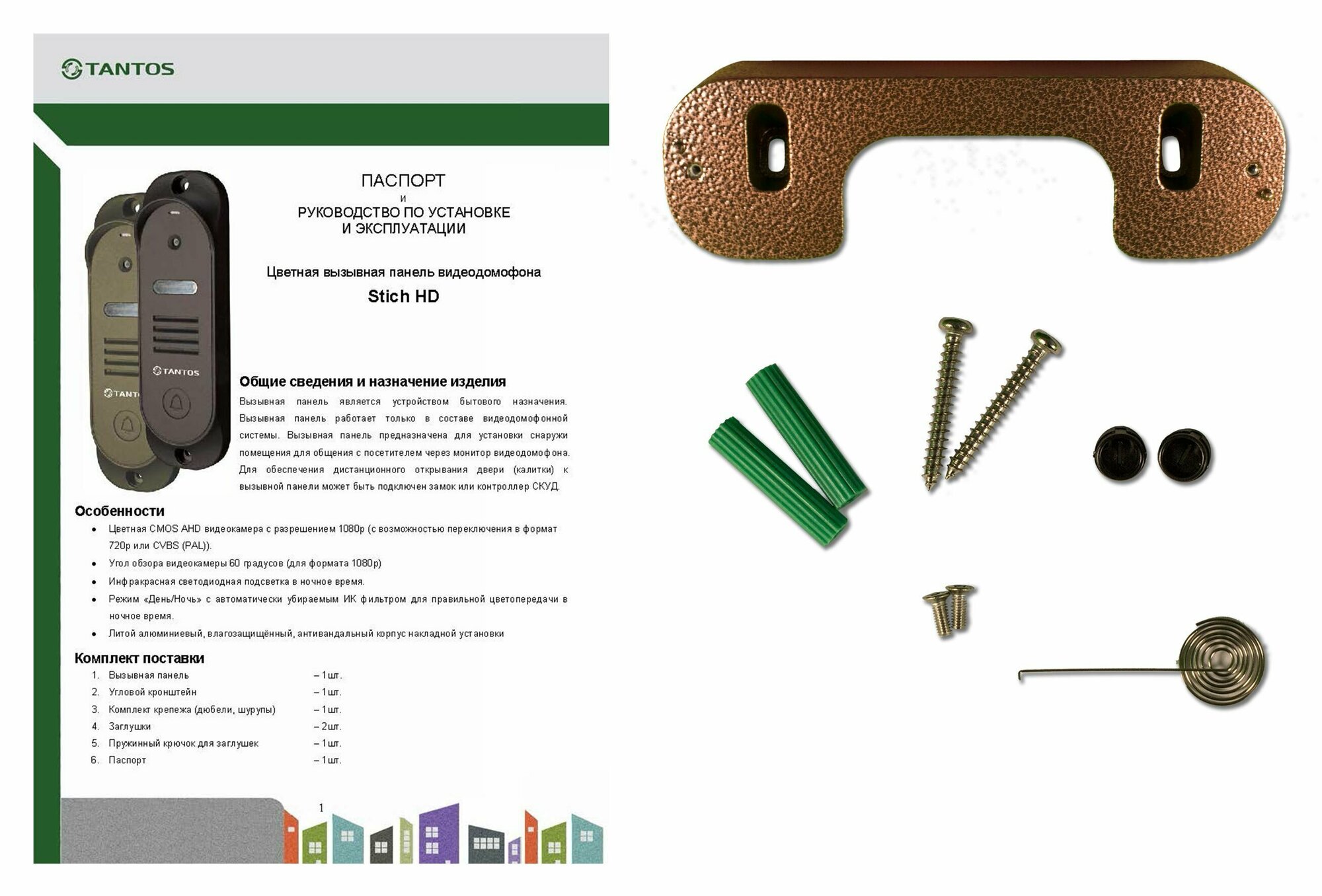 Вызывная панель видеодомофона Tantos Stich HD (медь), разрешение AHD 1080p/720p или CVBS (PAL), угол обзора 60 град., ИК-подсветка