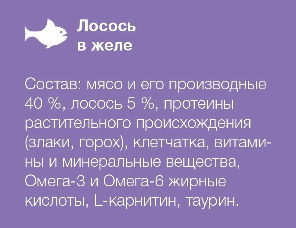 | Состав | мясо и его производные – 40 % (в т.ч. лосось – 5 %), протеины растительного происхождения (злаки, горох), клетчатка, витамины и минеральные вещества, омега-3 и омега-6 жирные кислоты, таурин, L-карнитин |