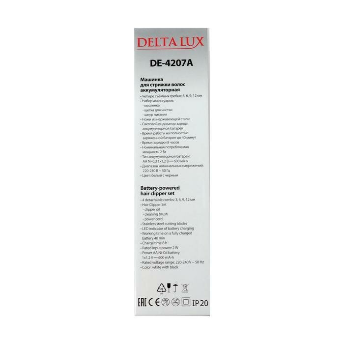 Машинка для стрижки аккумуляторная DELTA LUX DE-4207A, 4-СЪЕМНЫХ гребня, белый с чёрным