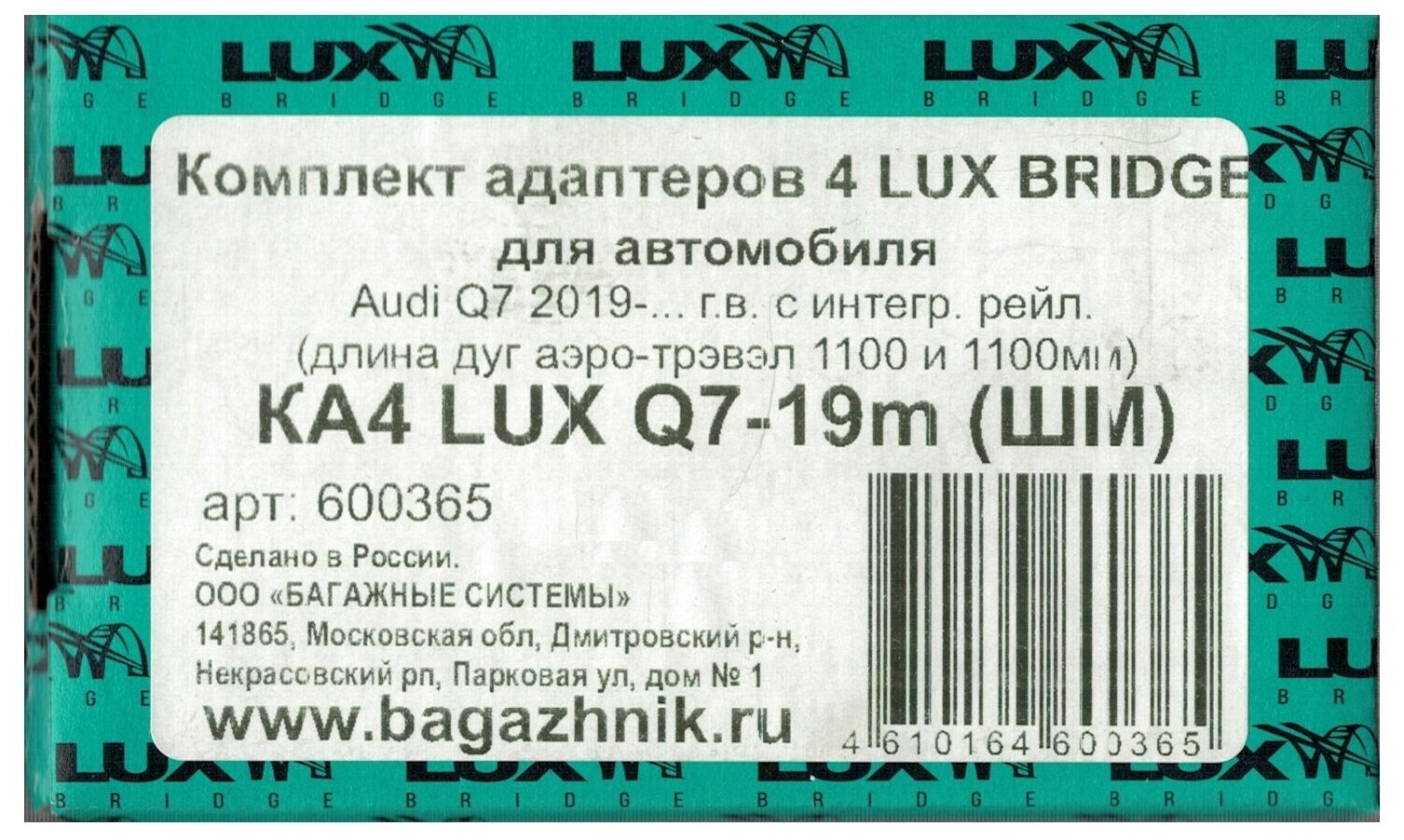 | Подробная комплектация | Комплект опор Lux Bridge, комплект адаптеров для Audi Q7 2015-..., комплект поперечных крыловидных дуг чёрного цвета |