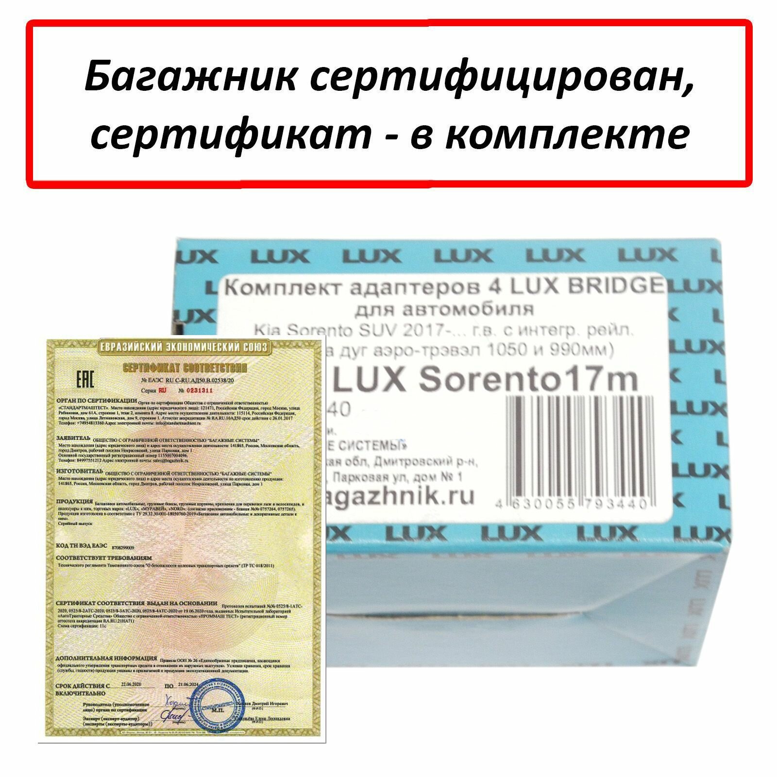 | Дополнительная информация | Бесшумная багажная система Lux Bridge (враспор, без вылетов) на интегрированные рейлинги Киа Соренто Прайм, 2017-2020 (Kia Sorento III Prime, 2017-2020), производство - Lux (Россия, Москва). Серебристые дуги. |