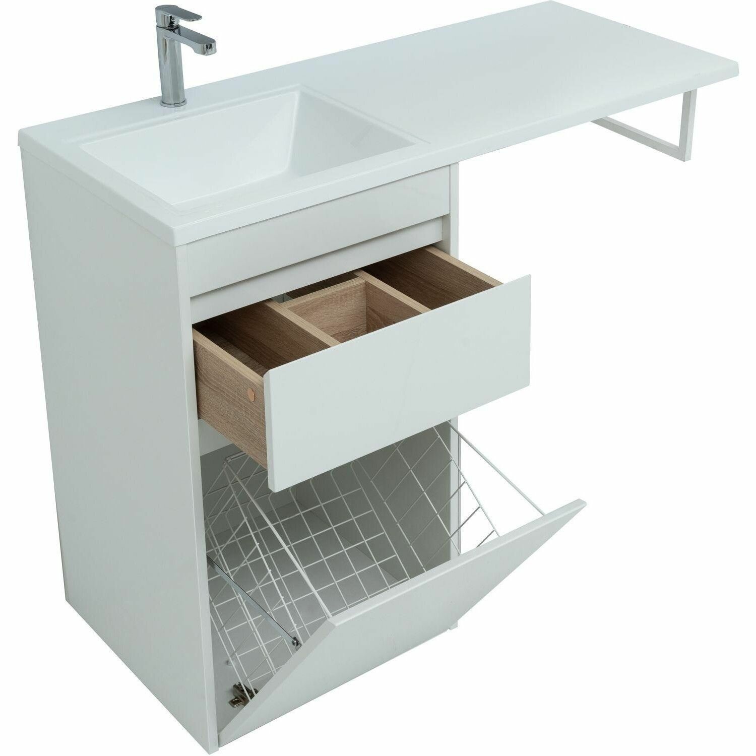 | Комплектация | Тумба под раковину, корзина для белья, откидной фасад, 1 выдвижной ящик, раковина в комплект не входит |