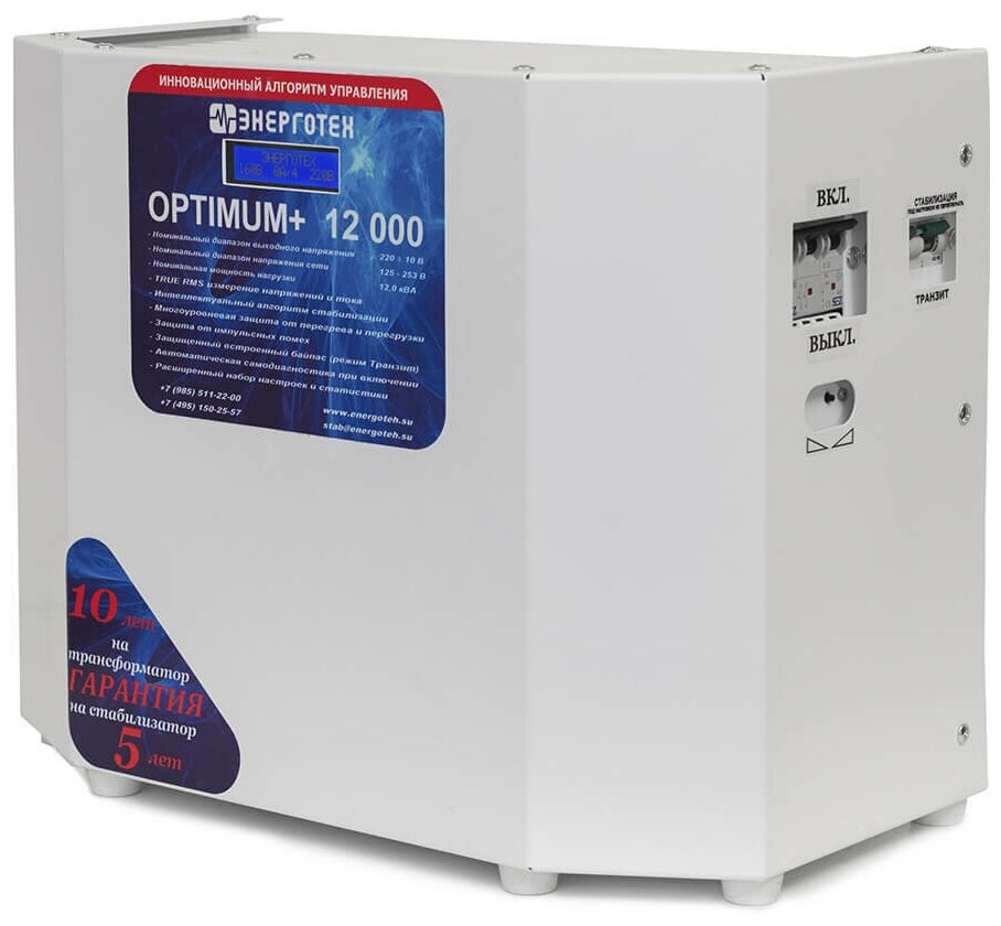 Стабилизатор напряжения Энерготех OPTIMUM+ 12000, 12кВт, однофазная сеть, тиристорный, бесшумный, для дома и дачи
