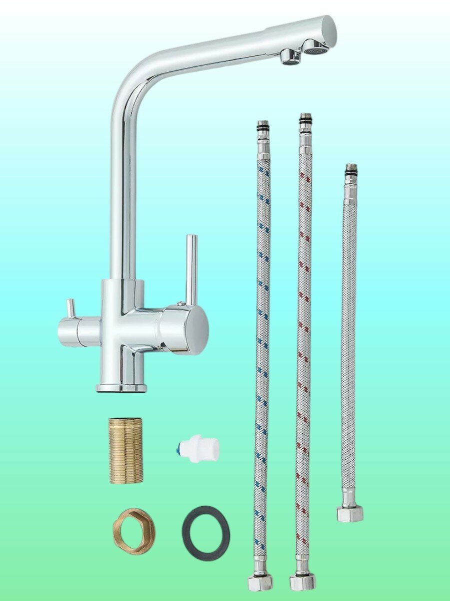 | Комплектация | смеситель, прокладка, монтажная гильза с резьбой, фиксирующая гайка, 3 шланга, под холодную, горячую и питьевую воду |