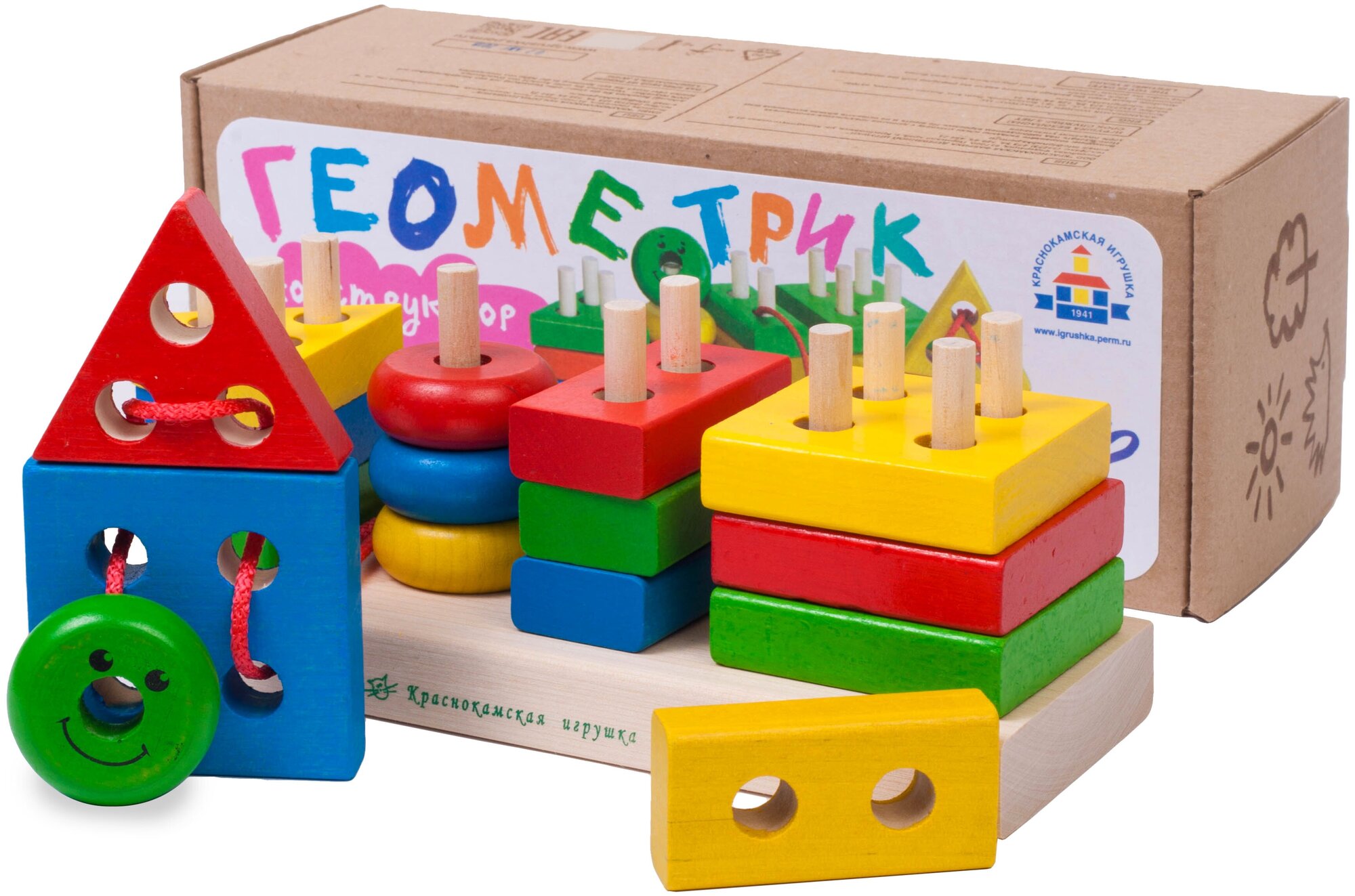 Деревянный конструктор-сортер Краснокамская игрушка "Геометрик", игра-шнуровка, 16 геометрических фигур