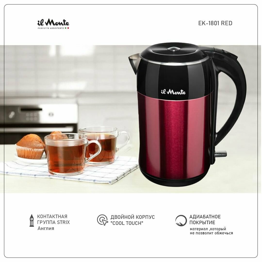 Купить Чайник электрический Премиум с адиабатным покрытием, Контактная группа (электроника) STRIX, Не нагревающийся, Полностью из нержавеющей стали, Литая стальная колба внутри, Объем 1,8 л., il Monte EK-1801 RED
