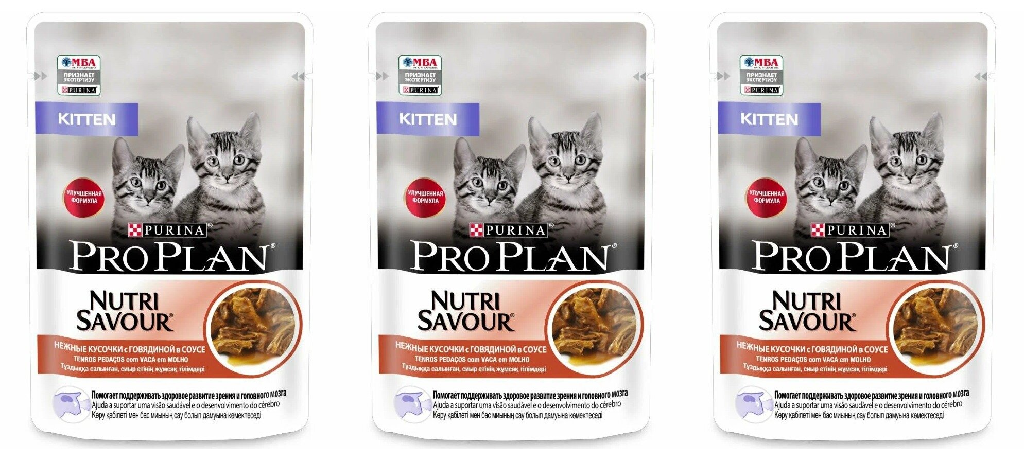 Купить Влажный корм для котят Purina Pro Plan KITTEN Nutri Savour Junior Beef, с говядиной, 3 шт. х 85 г (кусочки в соусе)