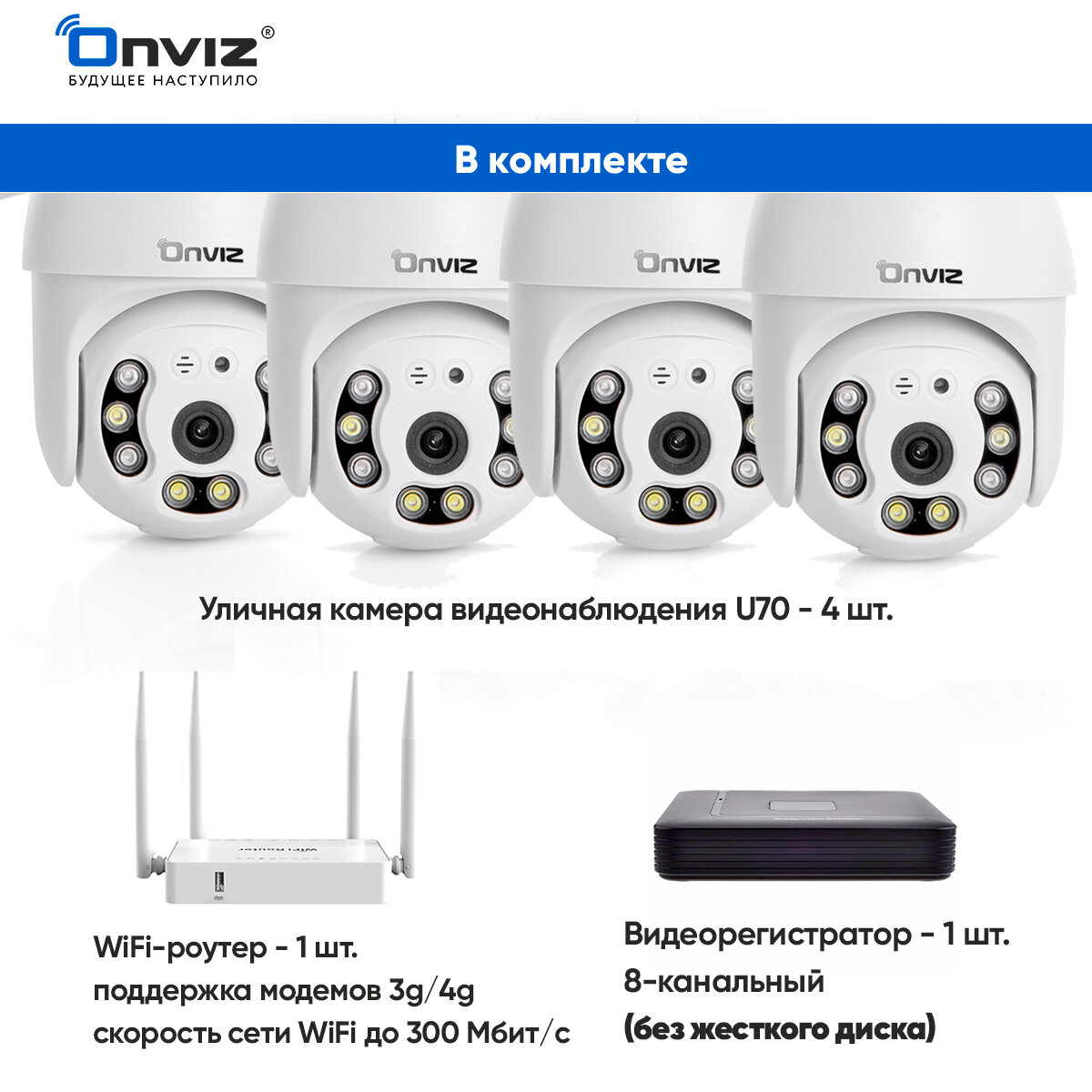 Комплект из 4-х купольных поворотных Wi-Fi камер видеонаблюдения Onviz U70 беспроводных / набор уличных камер / наружная скрытая для дома / для дачи интересное: