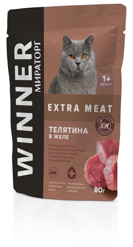 Корм влажный Мираторг Winner Extra Meat для взрослых кошек с чувствительным пищеварением, телятина в желе, 80 г