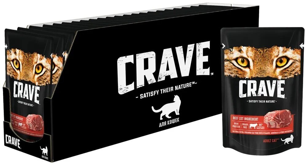 Влажный корм CRAVE для взрослых кошек, с говядиной (пауч) 70гр