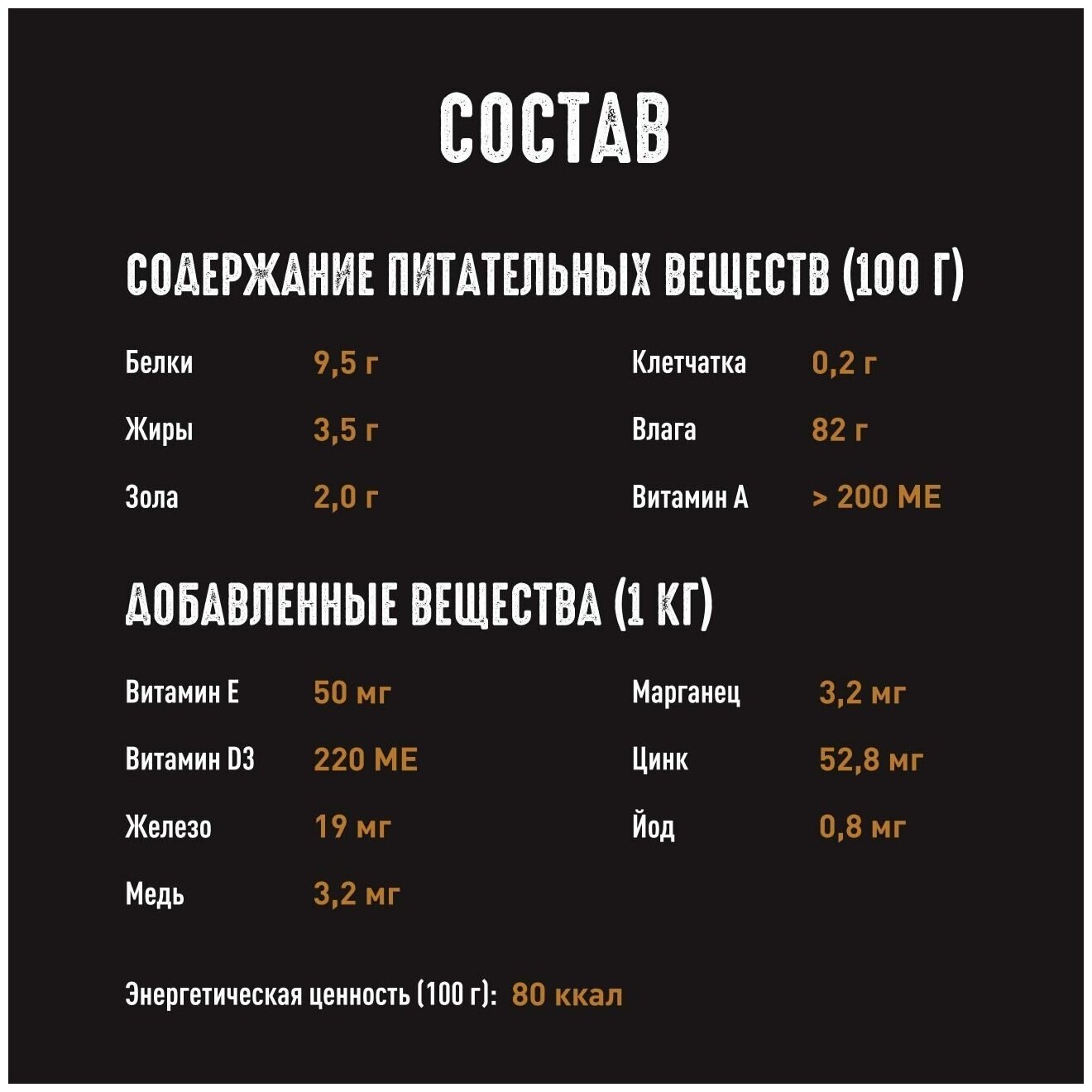 | Пищевая ценность | белки - 9,5 г; зола - 2,0 г; жиры - 3,5 г; клетчатка - 0,2 г; влага - 82 г |