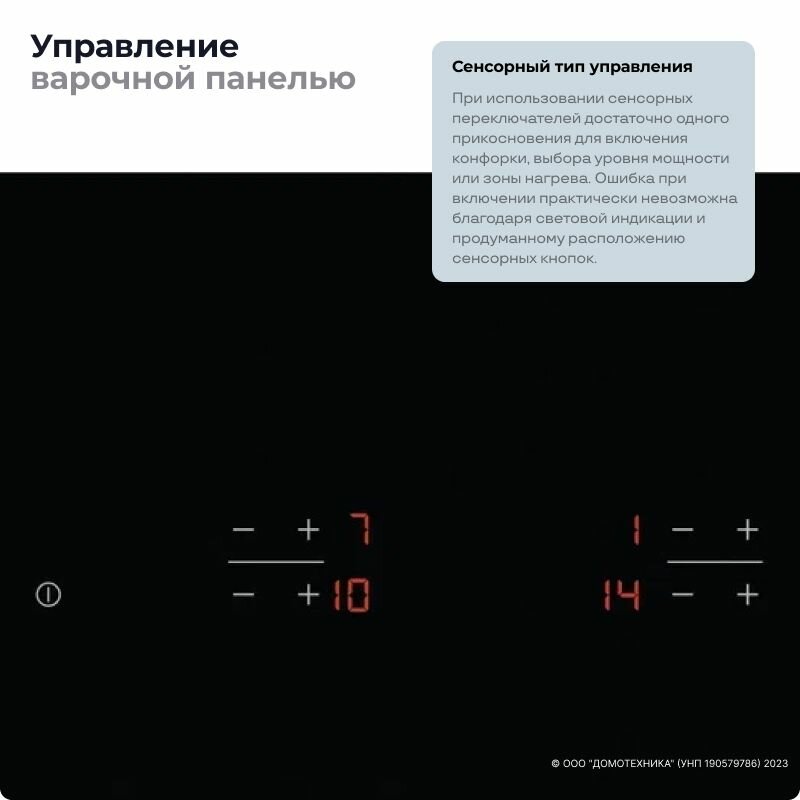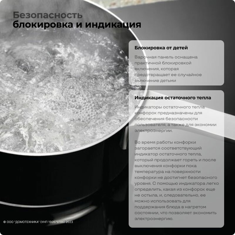 | Безопасность | защитное отключение конфорок / кнопка блокировки панели / индикатор остаточного тепла |