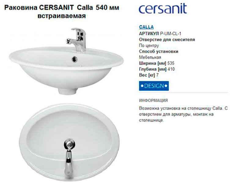 CERSANIT Calla раковина встраиваемая 540мм белая интересное:
