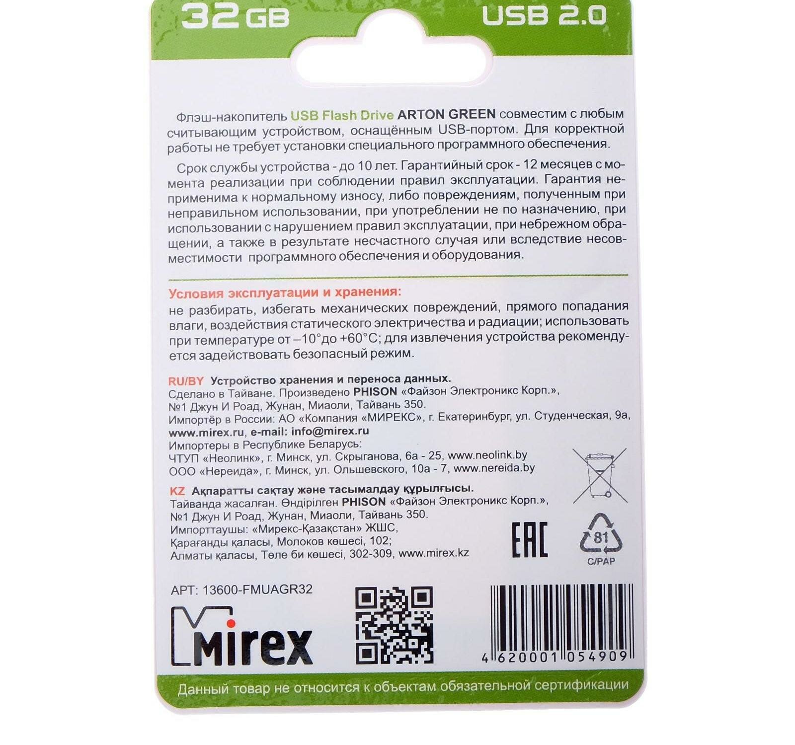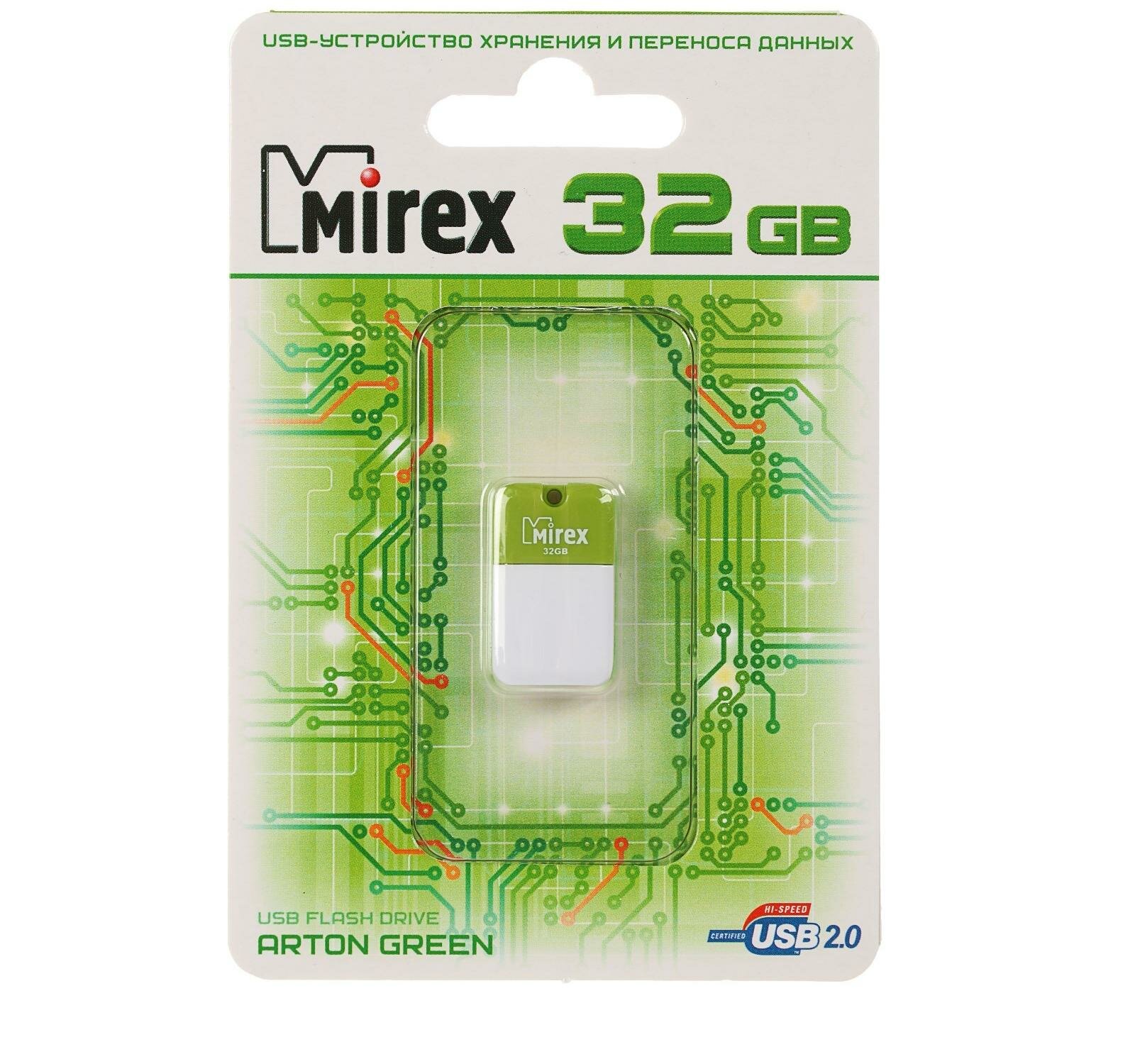 Флешка Mirex Arton Green 32 Гб usb 2.0 Flash Drive - зеленый