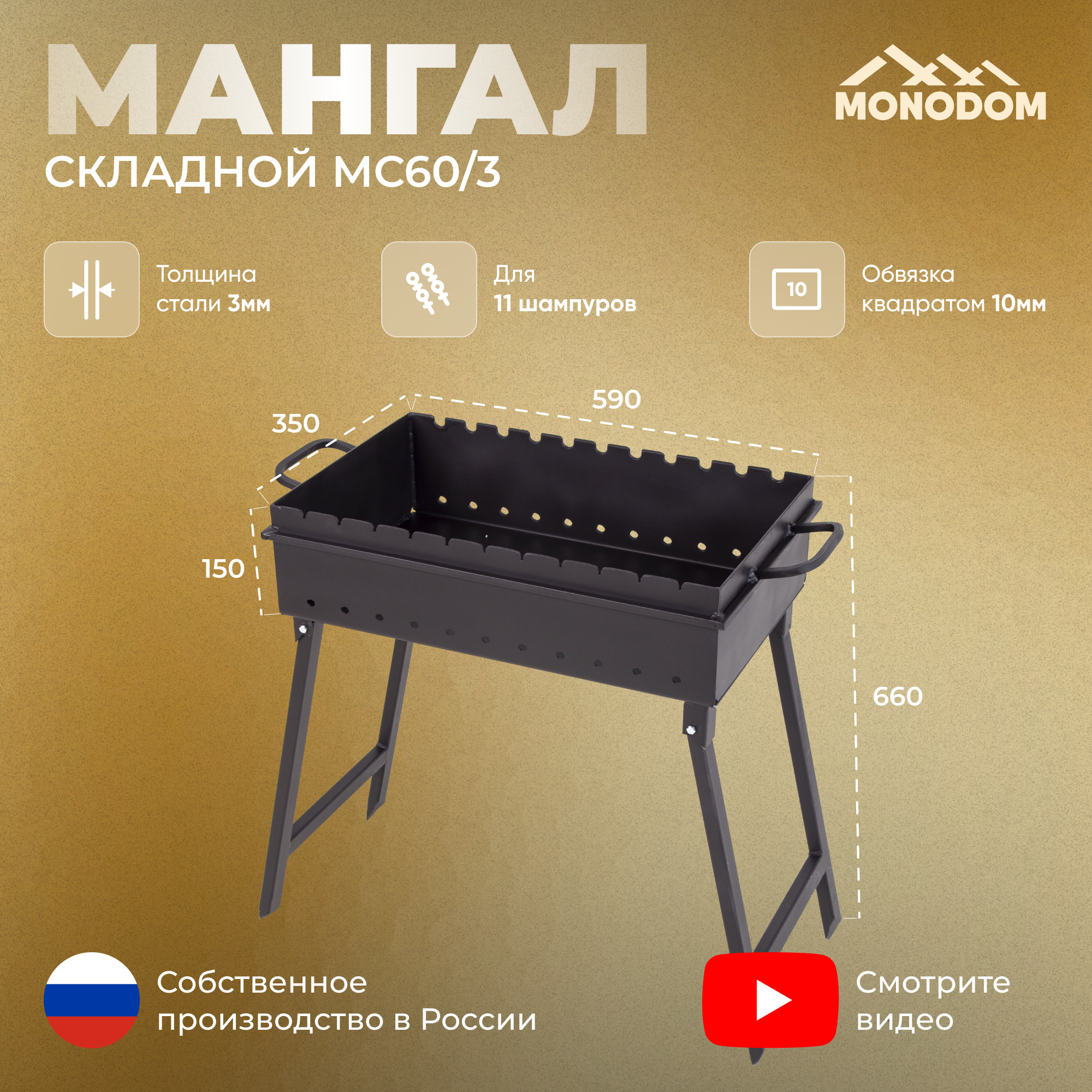 Мангал складной 3мм, МС-600, чаша 59х35х15 см, доп. ребро жесткости 10х10,11 прорезей для шампуров, Огнеупорная краска 1200С интересное: