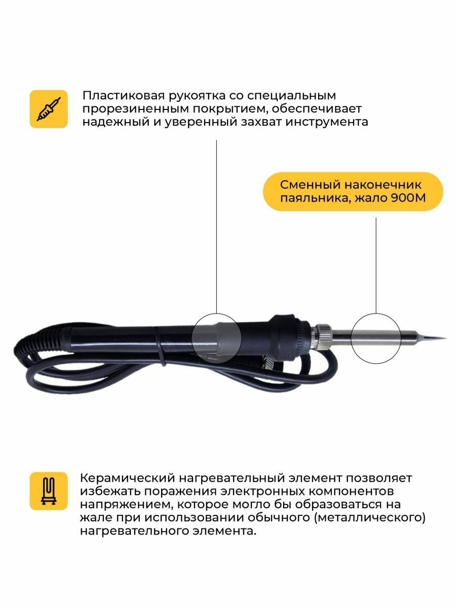 | Комплектация | паяльный блок, держатель паяльника, губка для очистки жал, фен, держатель фена, насадки на фен 3 шт. |