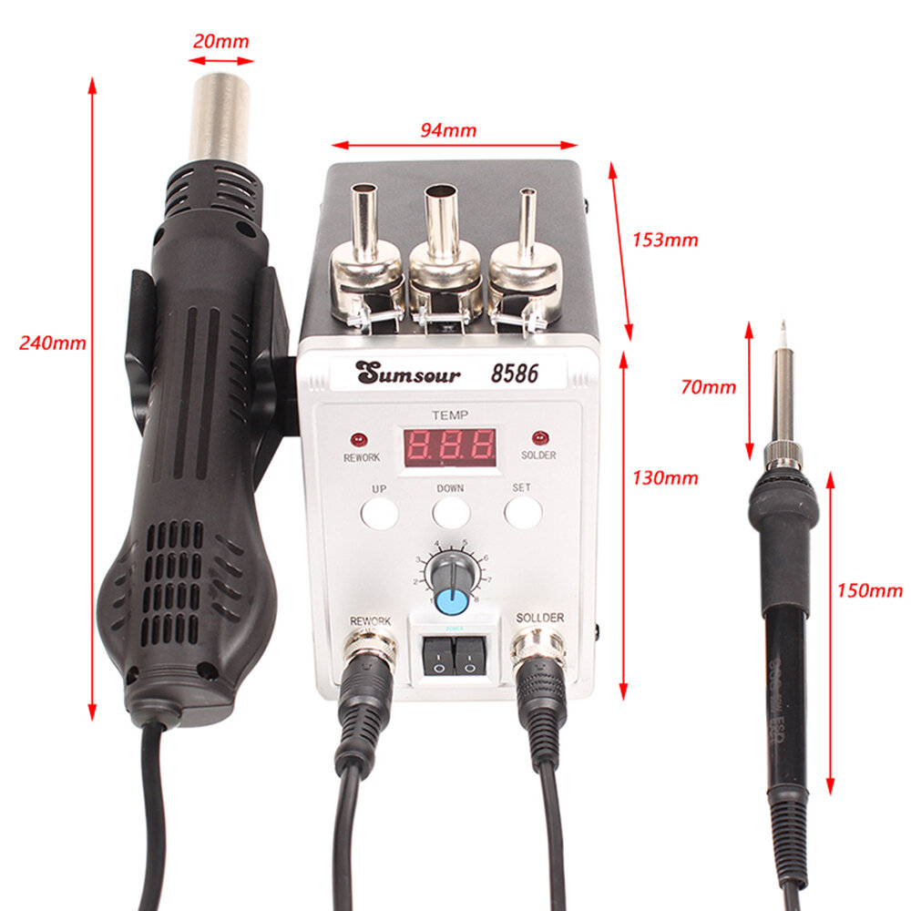 Паяльная станция / термофен / фен 8586 220В с феном 700Вт и паяльником 60Вт с регулировкой, инструментами, сменными насадками для SMD компонентов (У) интересное: