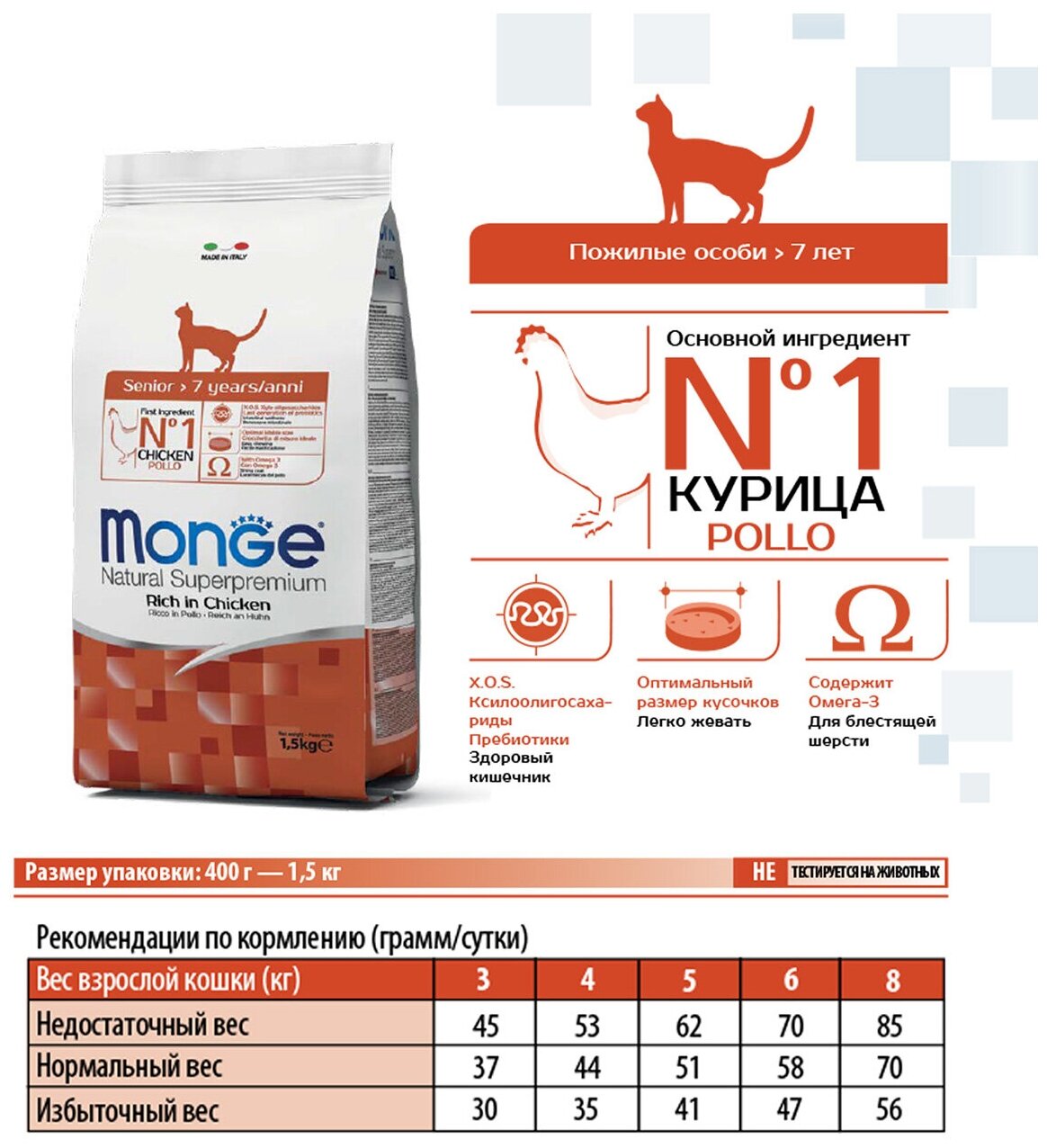 Ниже Вы можете прочитать отзывы на Monge Cat корм для пожилых кошек 400г, ознакомится с подробными характеристиками, посмотреть интересные обзоры и фотографии на Monge Cat корм для пожилых кошек 400г.