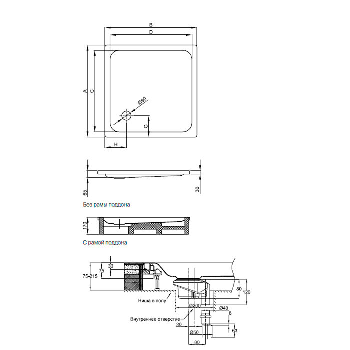 River Поддон для душа WEMOR 70/14 S квадратный 700*700*140 мм, с сифоном