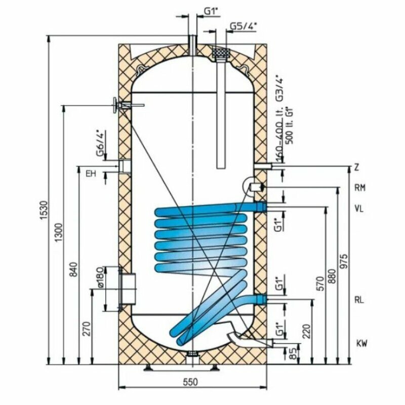| Дополнительная информация | с нижним теплообменником и возможностью установки дополнительных ТЕНов; максимальная мощность теплообменника: 45 кВт; макс. давление воды: 7 атм; число теплообменников: 1; площадь теплообменника: 1.5 м²; диаметр входа линии рециркуляции: ¾; вход линии рециркуляции |