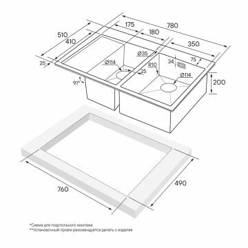 | Особенности | дополнительная чаша / корзинчатый вентиль / отверстие под смеситель / сливная арматура |