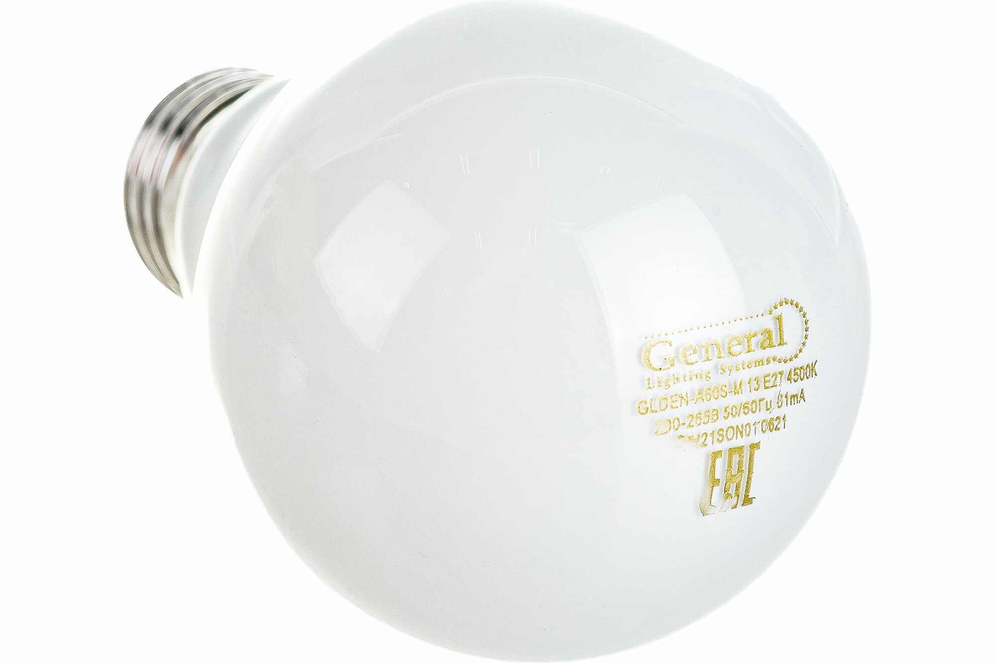 Лампа светодиодная General ЛОН A60 E27 13W 4500K 4K 60x105 филамент (нитевидная) матовая 649939
