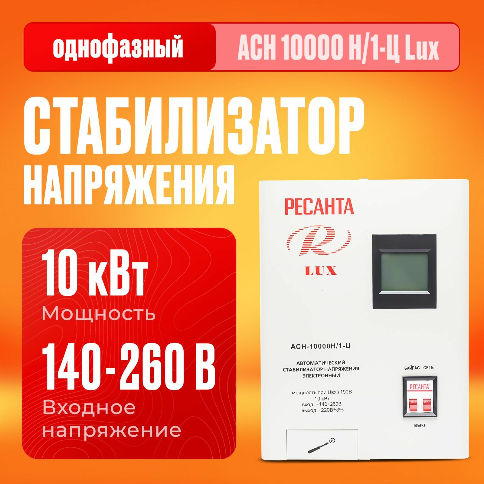 Стабилизатор напряжения серии LUX РЕСАНТА АСН-10000Н/1-Ц, 10 кВт, настенный