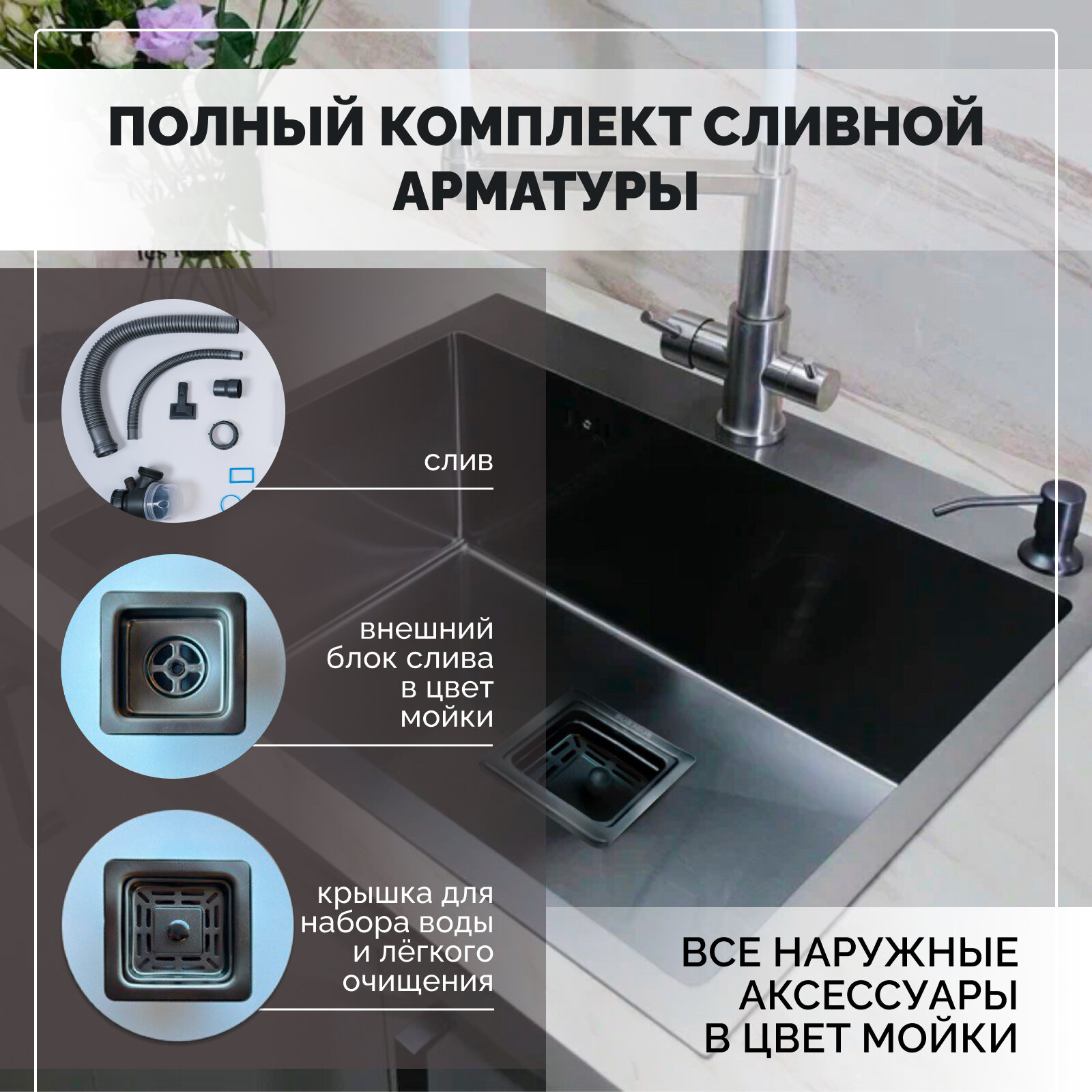 | Особенности | PVD покрытие / дозатор для мыла / коландер / отверстие под смеситель / сливная арматура |