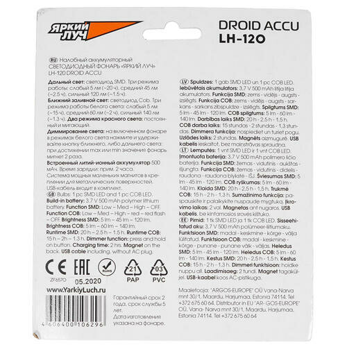 Фонарь Яркий ЛУЧ LH-120 "droid Accu" налобный, SMD 120лм 3реж + COB 140лм 5реж, диммер, Li-Po 500mAh .