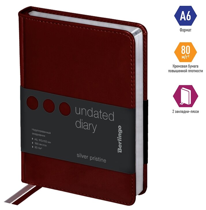 Ежедневник недатированный Berlingo A6, 160 листов, кожзам, "Silver Pristine", серебряный срез, красный (UD0_82602)