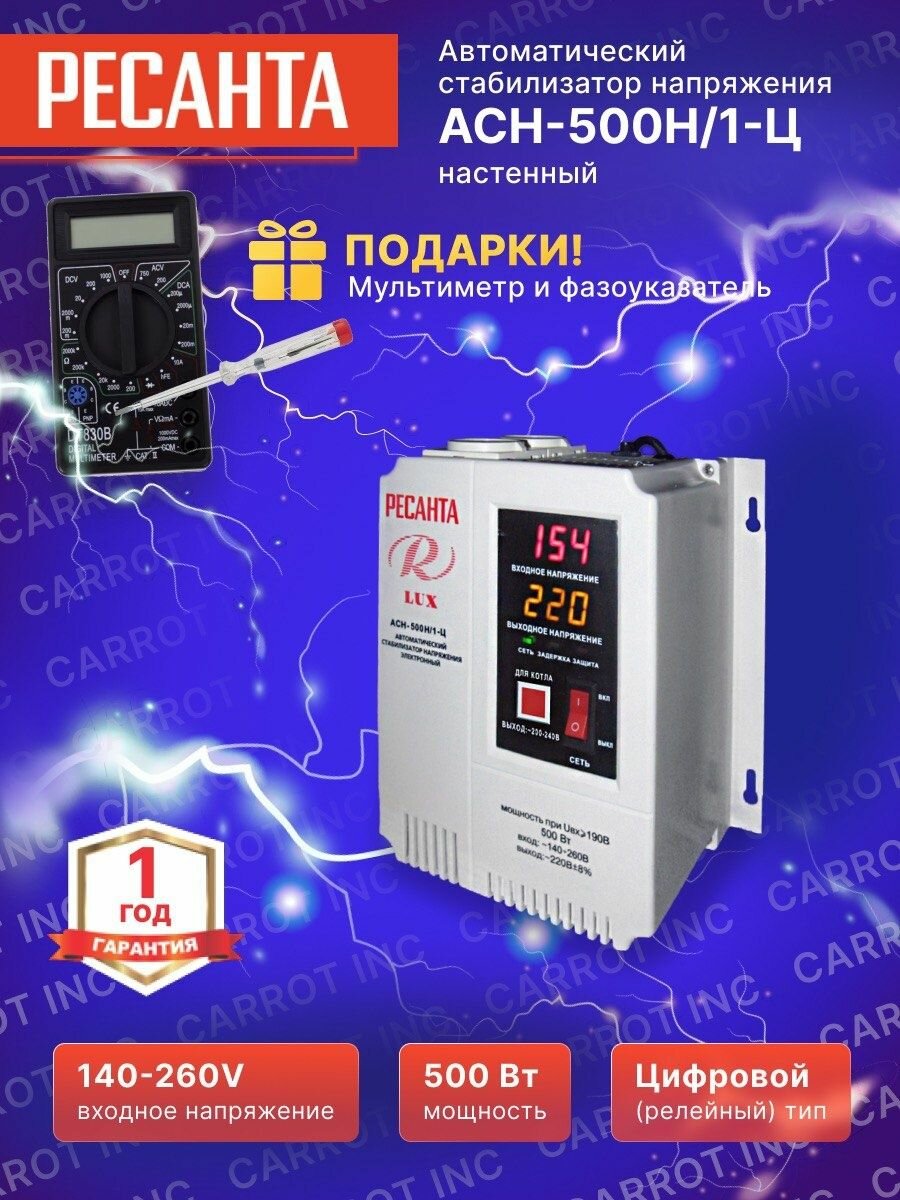 Стабилизатор напряжения однофазный АСН-500Н/1-Ц Ресанта LUX, 0.5 кВт