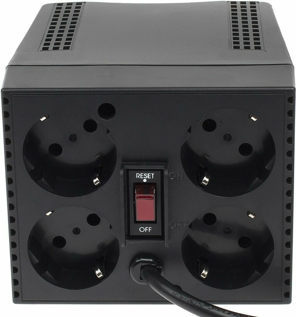 | Плюсы: | Не большая цена, небольшие размеры и не большой вес. Практически бесшумный. Покупал для компьютера, подключил ПК и всю сопутствующую технику (монитор, колонки, принтер) поставил под стол и всё. Слшу только лёгкое пощёлкивание когда реле переключает обмотки трансформатора при скачках напряжения. |
