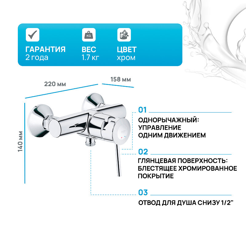 Смеситель однорычажный для душа, GROHE BauClassic, хром, (32867000)