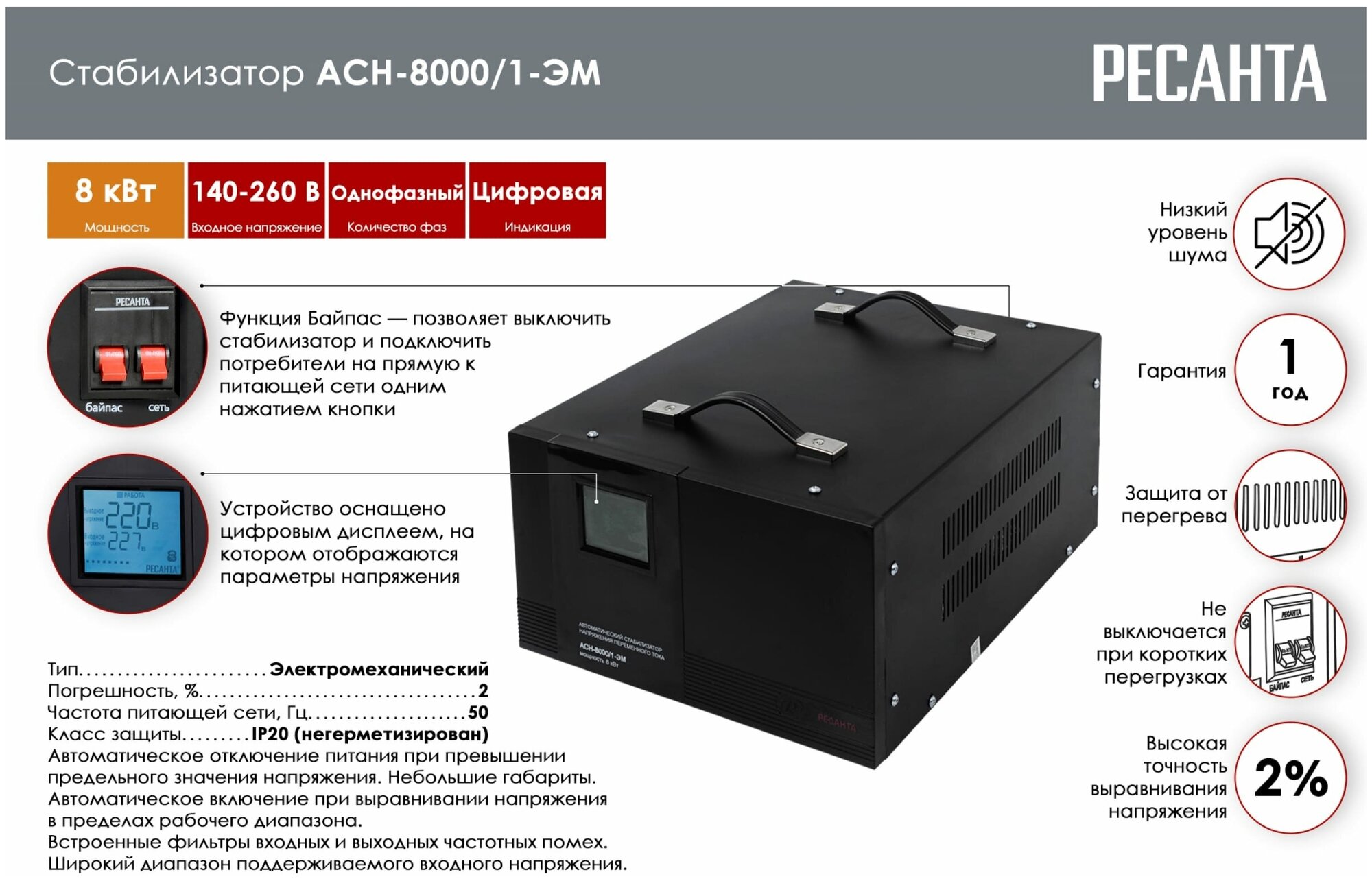 Стабилизатор напряжения однофазный РЕСАНТА АСН-8000/1-ЭМ, 8 кВт, 140-260В