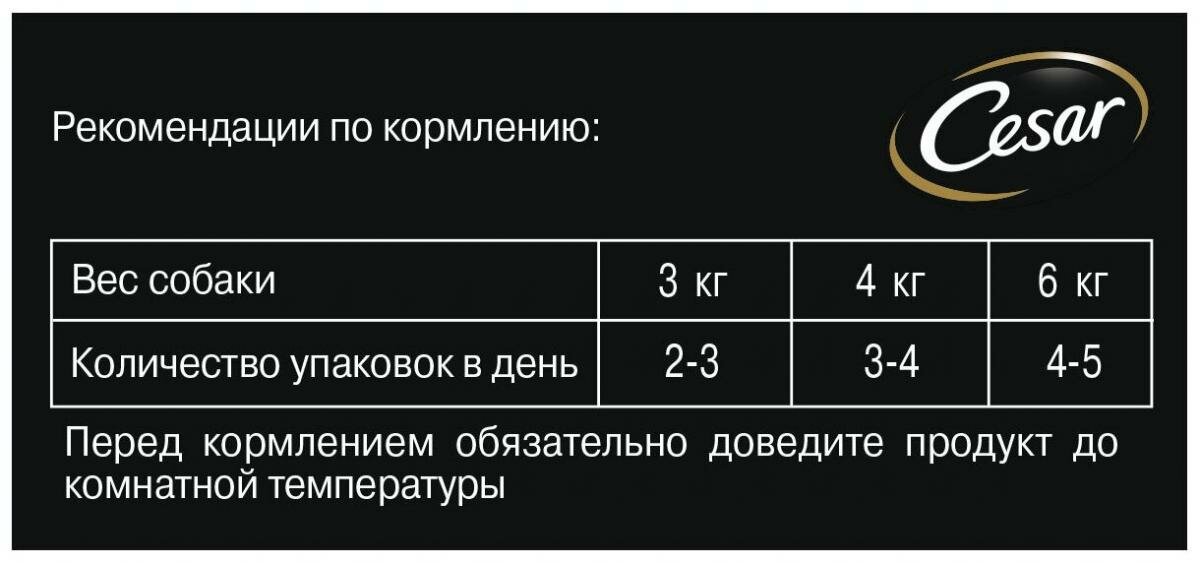 | Дозировка | - для собак весом от 3 до 4-х кг - не более 2-3-х упаковок в день r - для собак весом от 4 до 6 кг - не более 3-4-х упаковок в день r - для собак весом 6 кг - не более 4-5-ти упаковок в день |