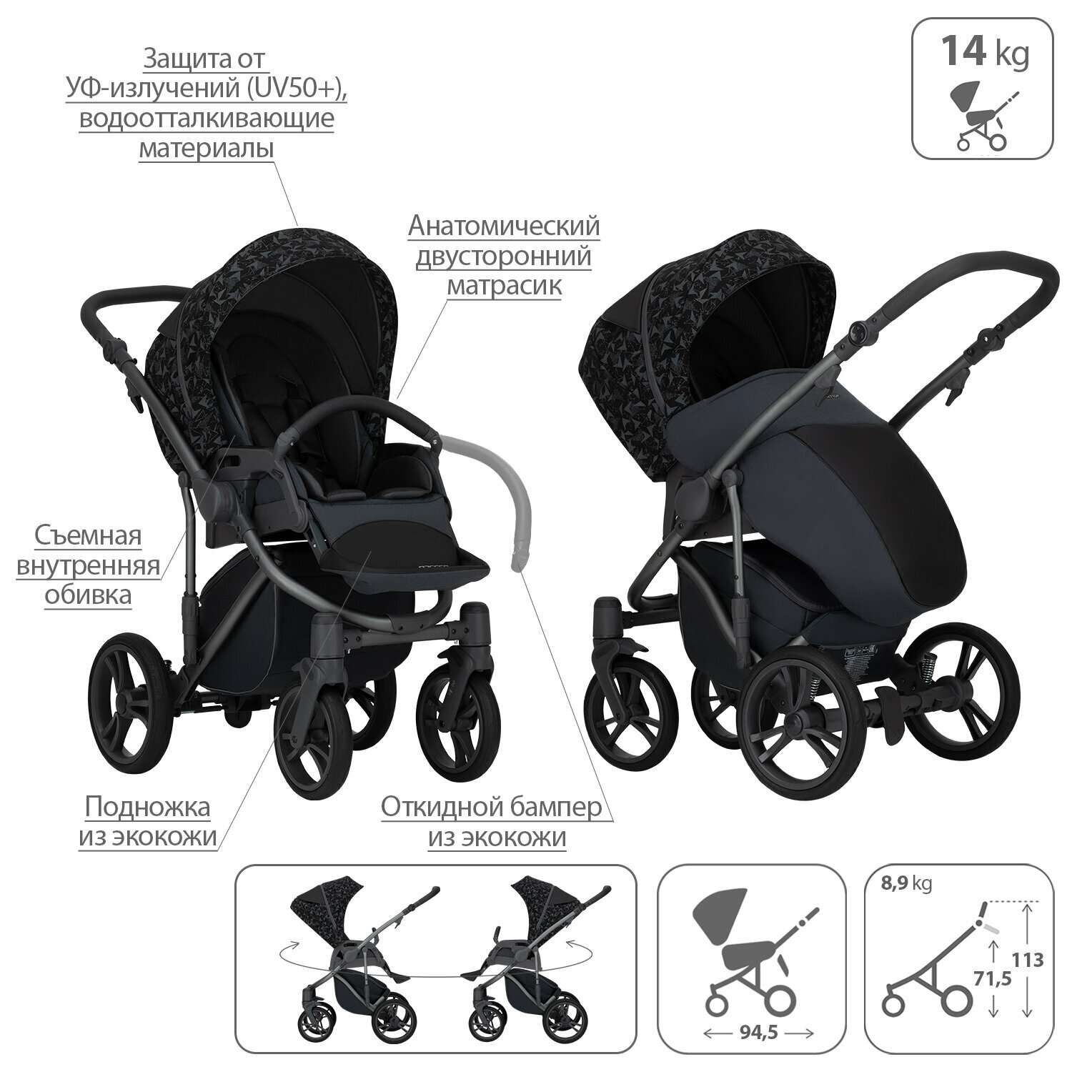 | Аксессуары в комплекте | антимоскитная сетка, бампер, дождевик, накидка на ноги, подстаканник, солнцезащитный козырек, сумка |