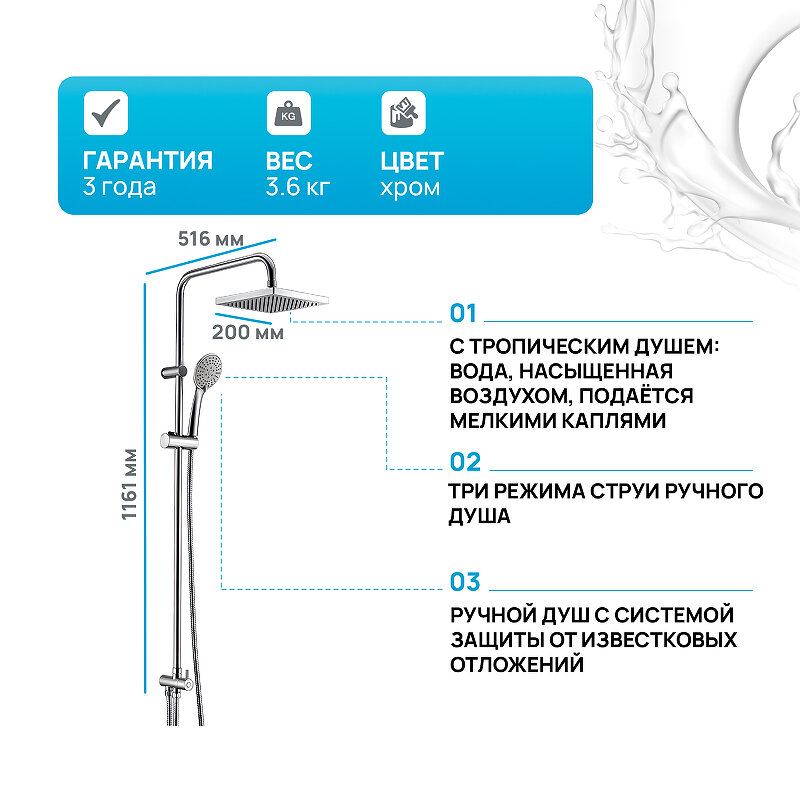 | Дополнительная информация | высота стойки для душа: 1161 мм; длина верхнего душа: 200 мм; ширина верхнего душа: 200 мм |