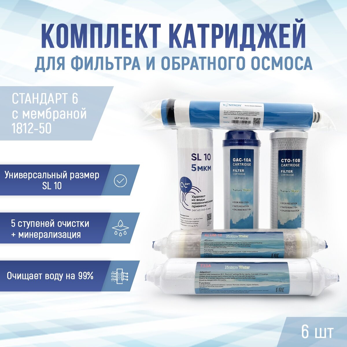 Сменные фильтры, комплект картриджей "Стандарт 6" с мембраной 1812-50, подходит к Гейзер Барьер Аквафор NatureWater AquaPro Raifil Atoll Unicorn интересное:
