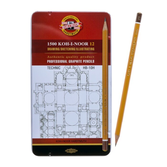 Купить Koh-I-Noor Набор карандашей чернографитных разной твердости 12 штук Koh-I-Noor 1500, HB-10H, в металлическом пенале