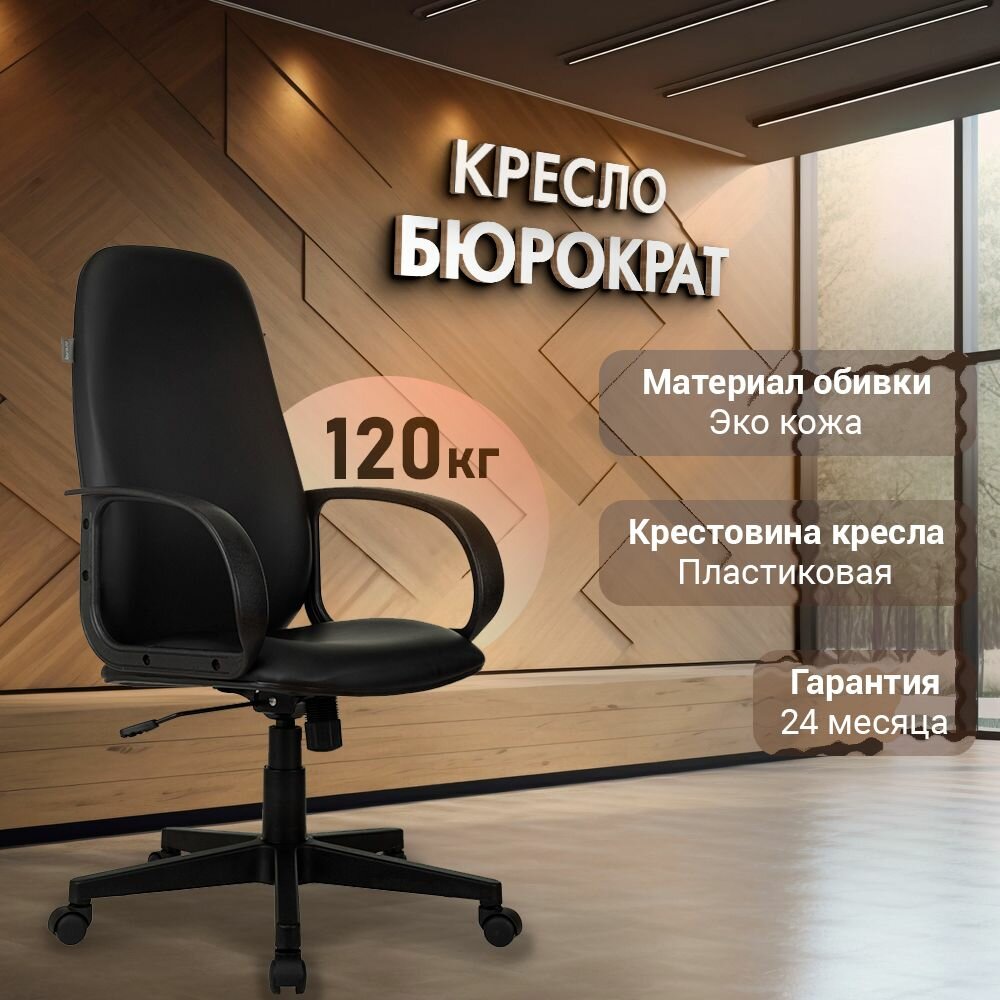 Кресло компьютерное рабочее Бюрократ Ch-808AXSN на колесах, с подлокотниками, низкой спинкой, до 120 кг, экокожа черное