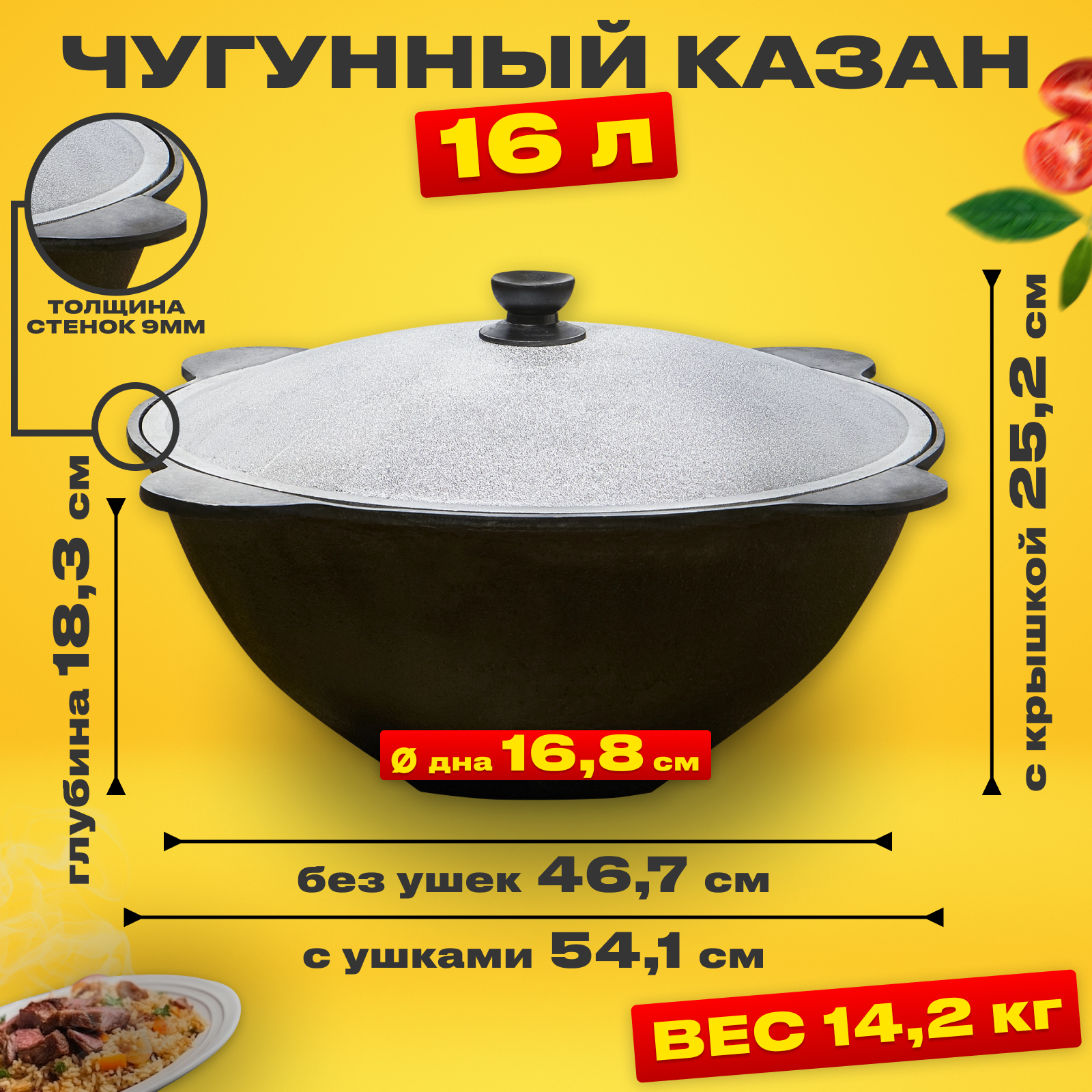 | Дополнительная информация | казан - диаметр 42 см, крышка алюминиевая, материал чугун, объём 16 л, толщина стенок 9 мм |