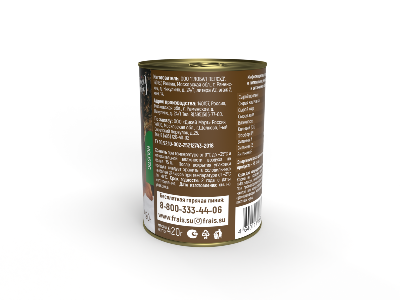 | Состав | мясо и мясные субпродукты в кусочках - 70% (в том числе говядина минимум 12%, рубец минимум 6%), витамины (А, витамины группы В, D3, Е, РР), минеральные вещества (фосфор, кальций, натрий, калий, магний, марганец, цинк, медь, йод), пищевой коллаген. |