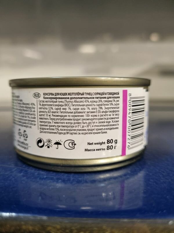 | Плюсы: | Отличные консервы. Курица, говядина основа этого корма |
