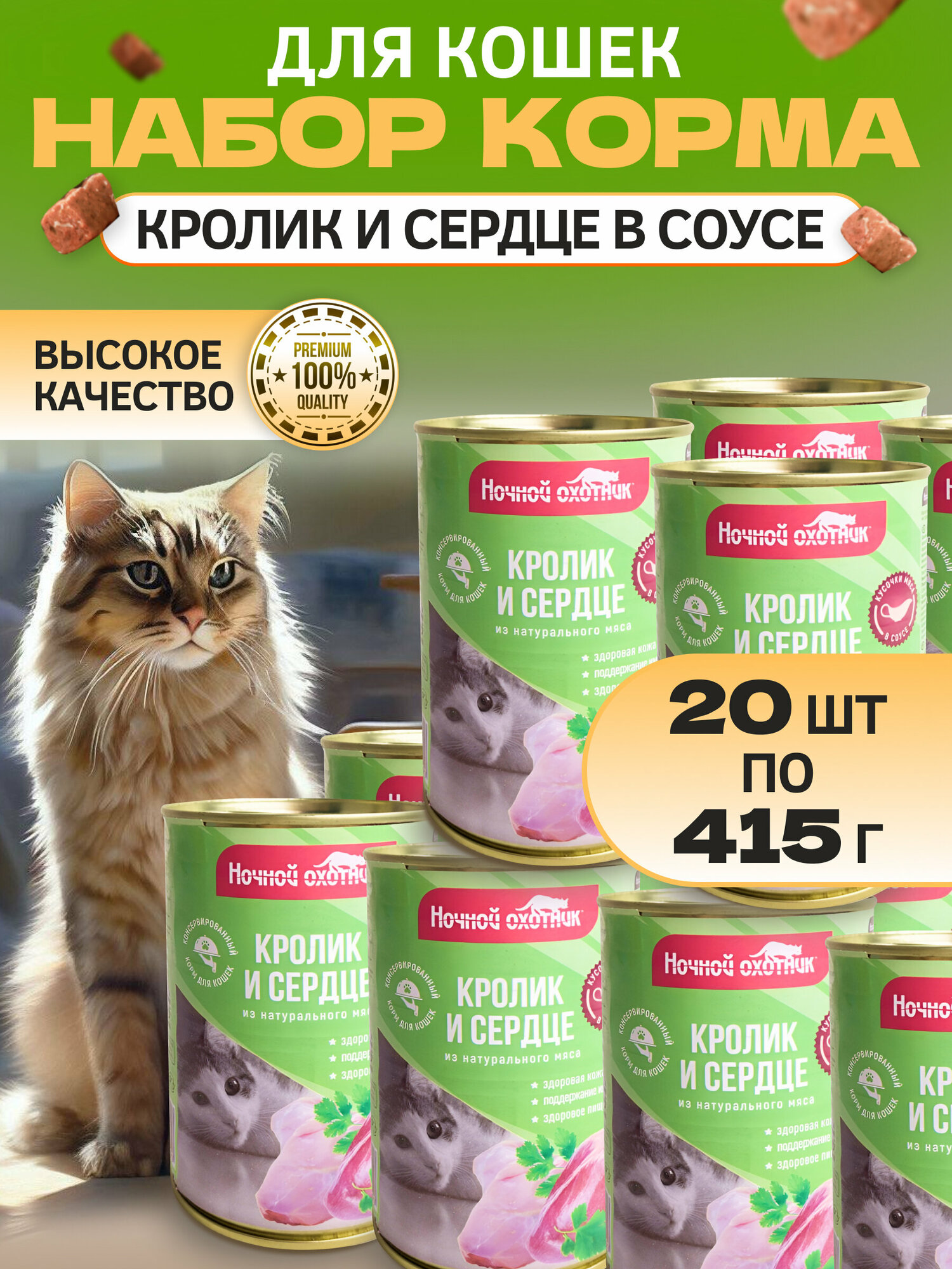 Ночной охотник Консервы для кошек кролик и сердце в соусе, 415г 0.415 кг