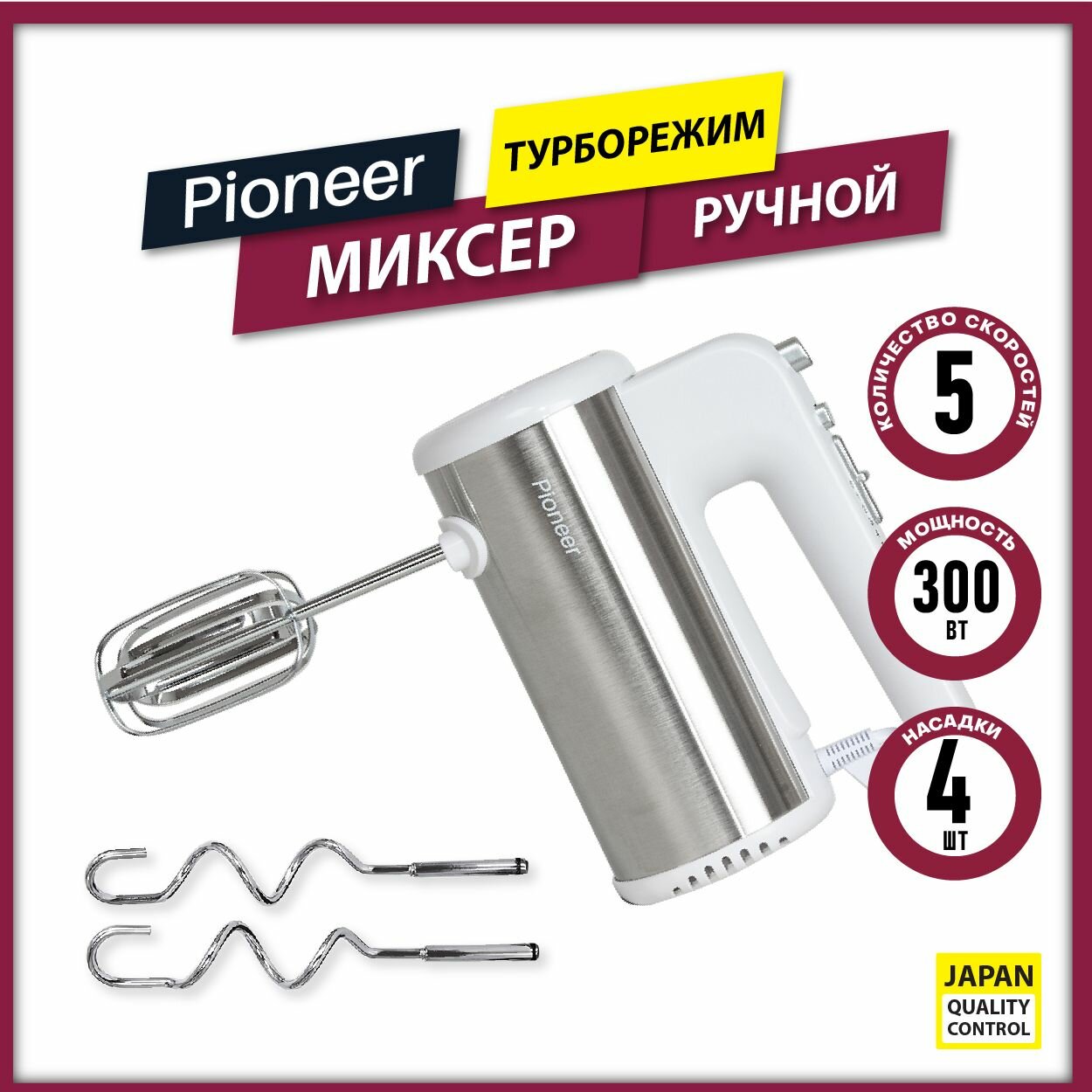 Купить Миксер ручной Pioneer с турборежимом, 5 скоростей, 4 насадки, эффективная система охлаждения, 300 Вт