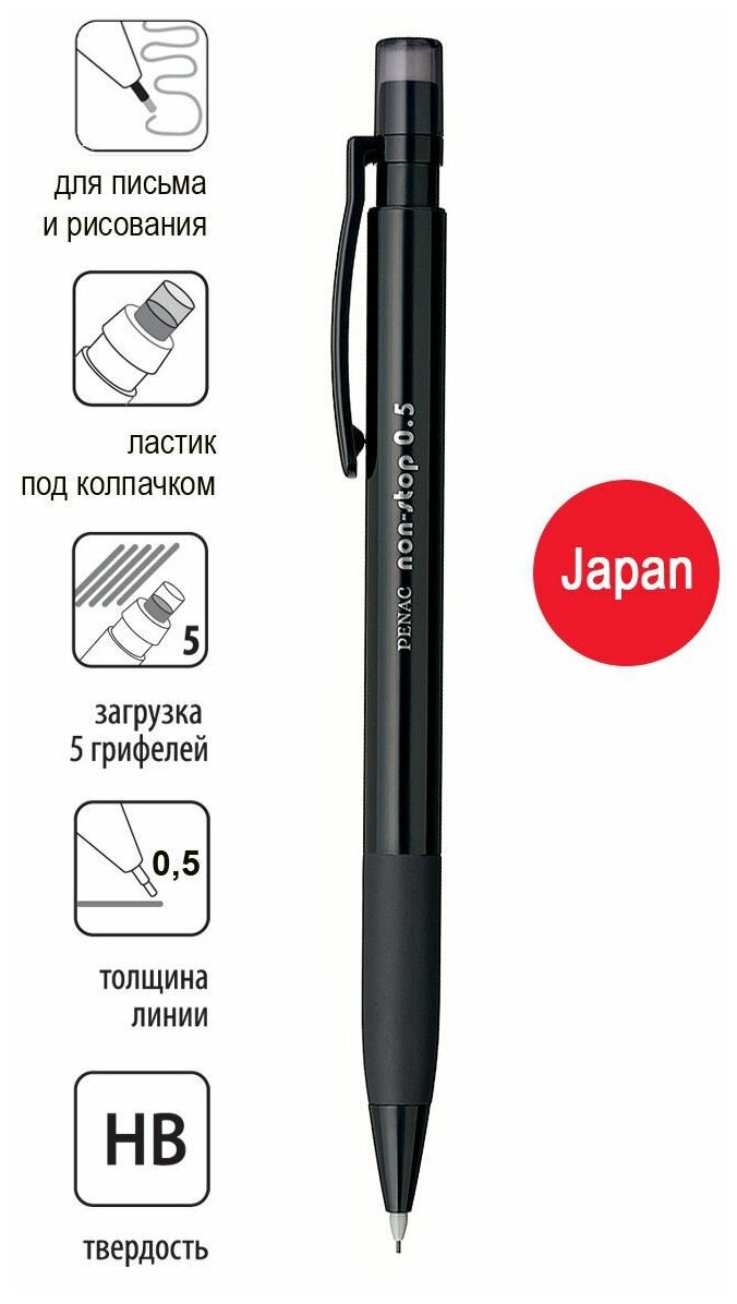 Карандаш механический с ластиком HB 0,5мм PENAC Non-Stop, черный (12шт) интересное:
